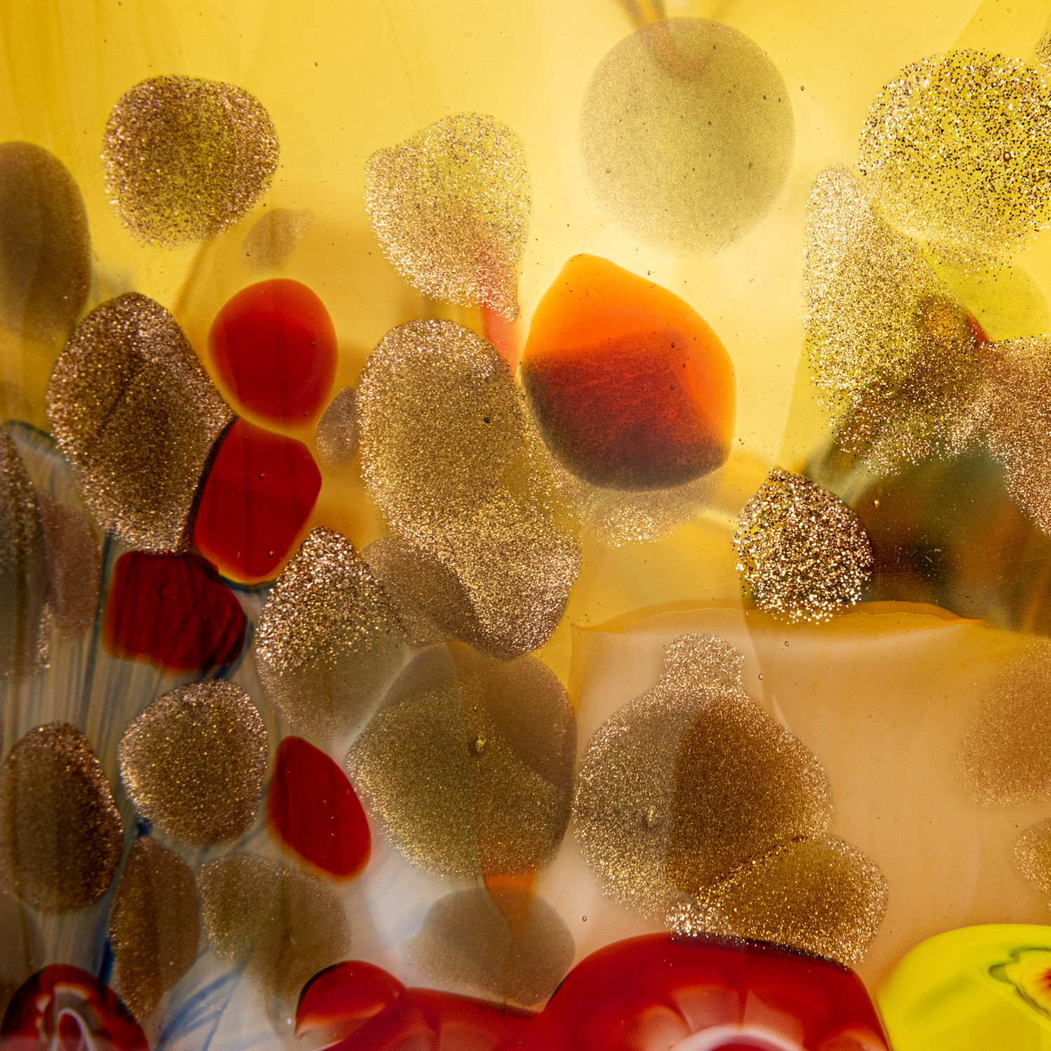 This Handmade Art Glass Vase is a celebration of creativity and craftsmanship. The gold glitter intertwined with the multi-colored abstract dots creates a dynamic and textured effect, reminiscent of a painter's palette. The vase's round shape and ruffled wide opening invite a modern twist on traditional glassware, making it a standout piece. It's designed to capture the essence of the bohemian spirit, the simplicity of Scandinavian design, and the rustic charm of the French countryside. It measures 11 inches in diameter and 10.5 inches in height, offering a generous space for creative floral arrangements. Whether used to hold a vibrant array of flowers or as a decorative object, this vase is sure to enchant and inspire.
