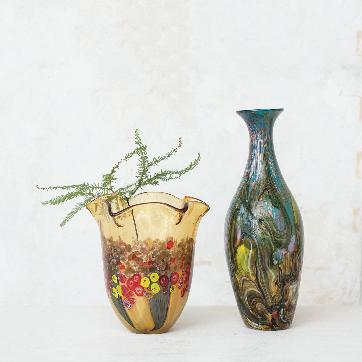 This handmade art glass vase is a testament to the beauty of skilled craftsmanship. The inclusion of gold glitter within the glass creates a shimmering effect that catches the light and the eye, making it a focal point in any setting. Its multi-colored design is reminiscent of a bohemian tapestry, while the narrow opening is ideal for displaying delicate floral arrangements. The vase's round form and considerable height offer a modern twist on traditional glassware, fitting seamlessly into various decor styles, from the laid-back coastal to the vibrant southwestern. It measures 6.25 inches in diameter and 18.75 inches in height, making it an elegant statement piece for any interior. It's not just a container for flowers; it's a piece of art that brings a touch of glamour and sophistication to the home.
