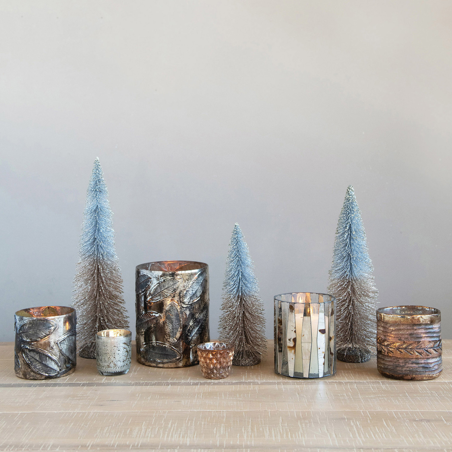 This candle holder is perfect for ambient lighting at the dinner table, or during Christmas parties. Made out of embossed mercury glass, this piece features an oxidized silver finish that blends in with any style decor. Fill with any candle for an ambient aesthetic.