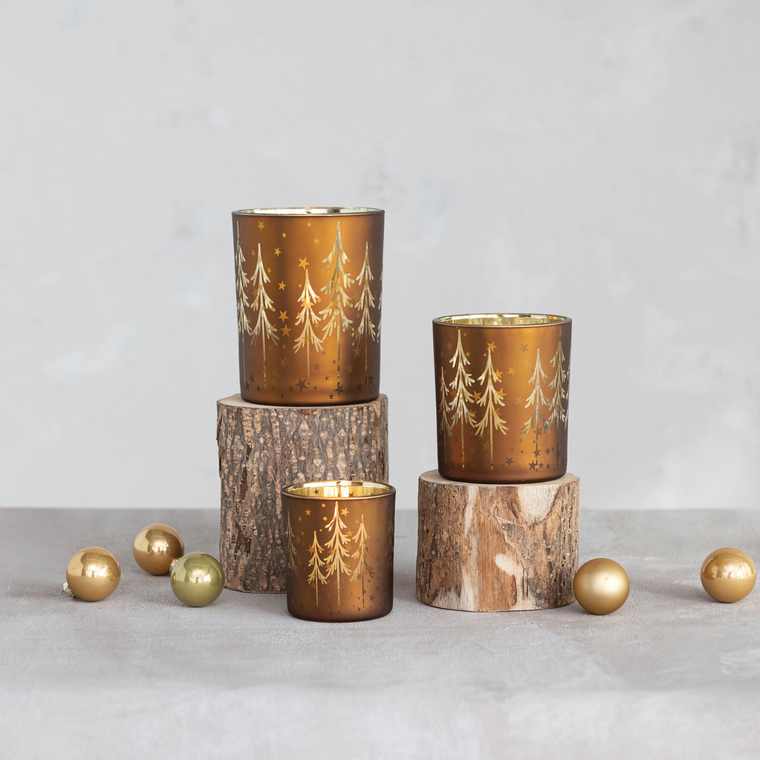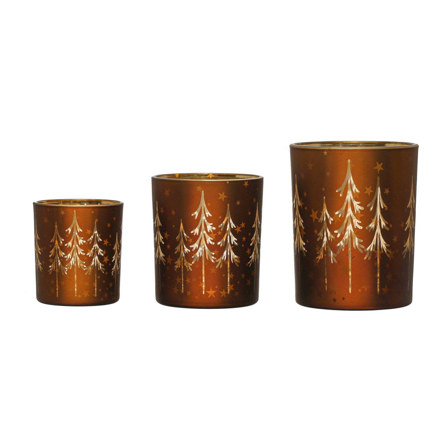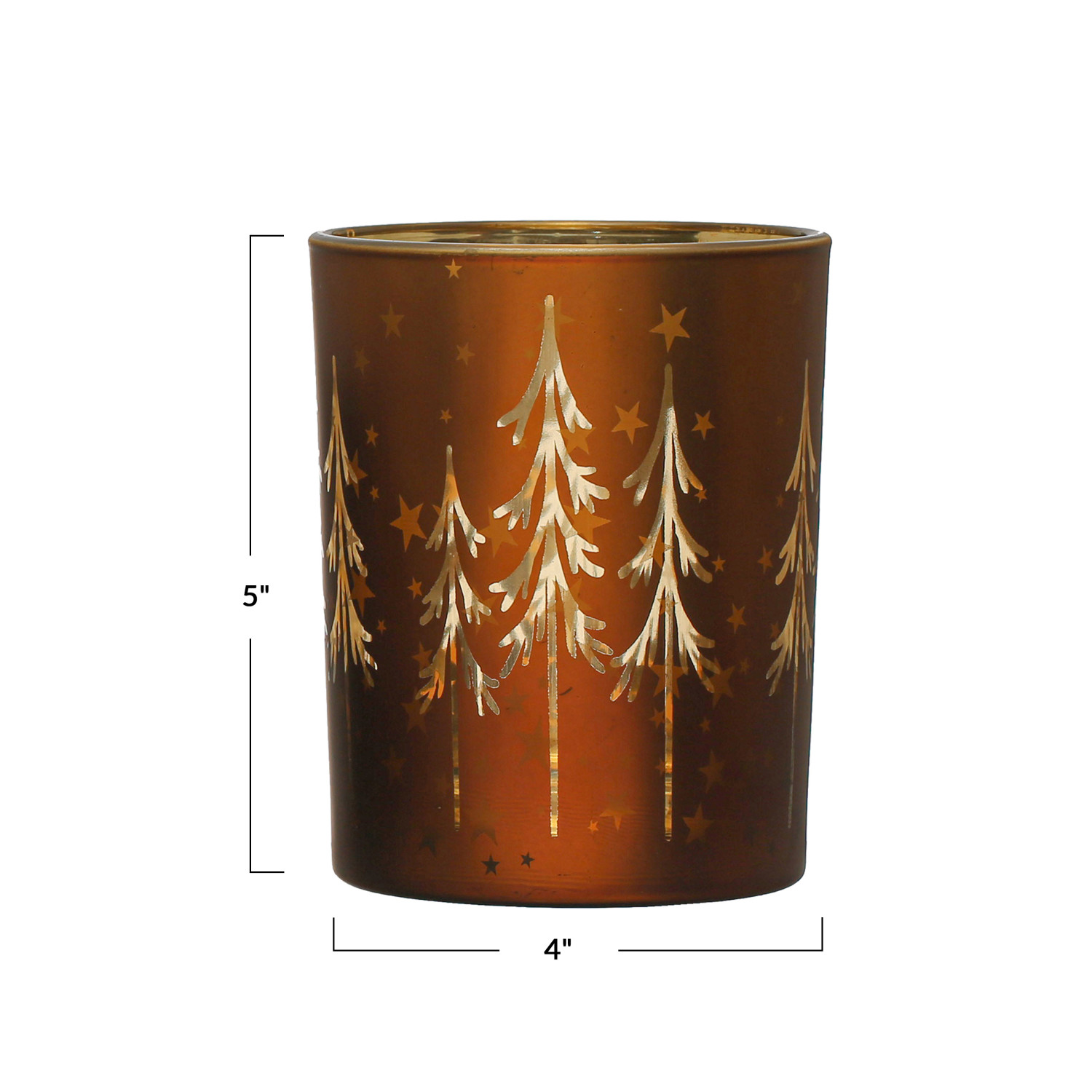 Catalog Name: 4" Round x 5"H Mercury Glass Tealight/Votive Holder w/ Laser Etched Trees, Brown & Gold Color