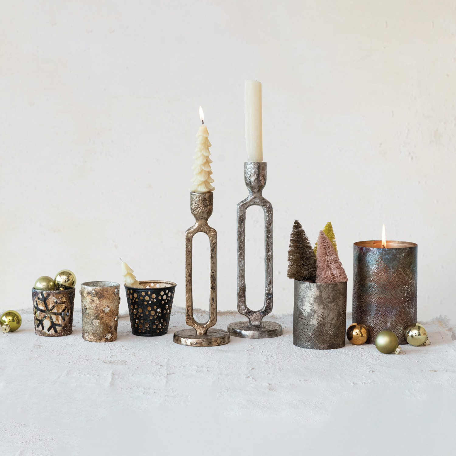 This tall aluminum taper candleholder is a testament to classic elegance and modern design. The oxidized gold finish provides a luxurious backdrop for the candlelight, casting a warm and inviting glow. Its stature makes it an ideal focal point for any setting, inviting a sense of grandeur and sophistication. Whether used as part of a centerpiece arrangement or as a standalone piece, this candleholder is sure to draw the eye and add a touch of sophistication to the home. Its design is both functional and decorative, making it a versatile choice for any setting. Elegant and durable, it's a candleholder that will be admired for years to come. A tall aluminum taper candleholder featuring an oxidized gold finish that exudes sophistication. A piece that seamlessly blends with any decor, its oxidized gold finish adds a touch of regal charm to both classic and contemporary settings. Ideal for creating a warm, inviting atmosphere in dining rooms, living spaces, or as a stately accent on a mantelpiece.