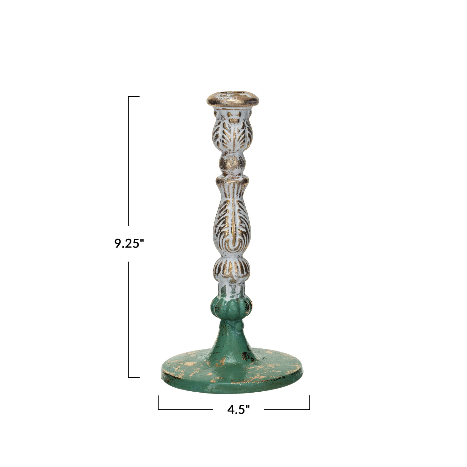 Cast Iron Taper Holder, Distressed Finish, Green, Gold & Cream Color