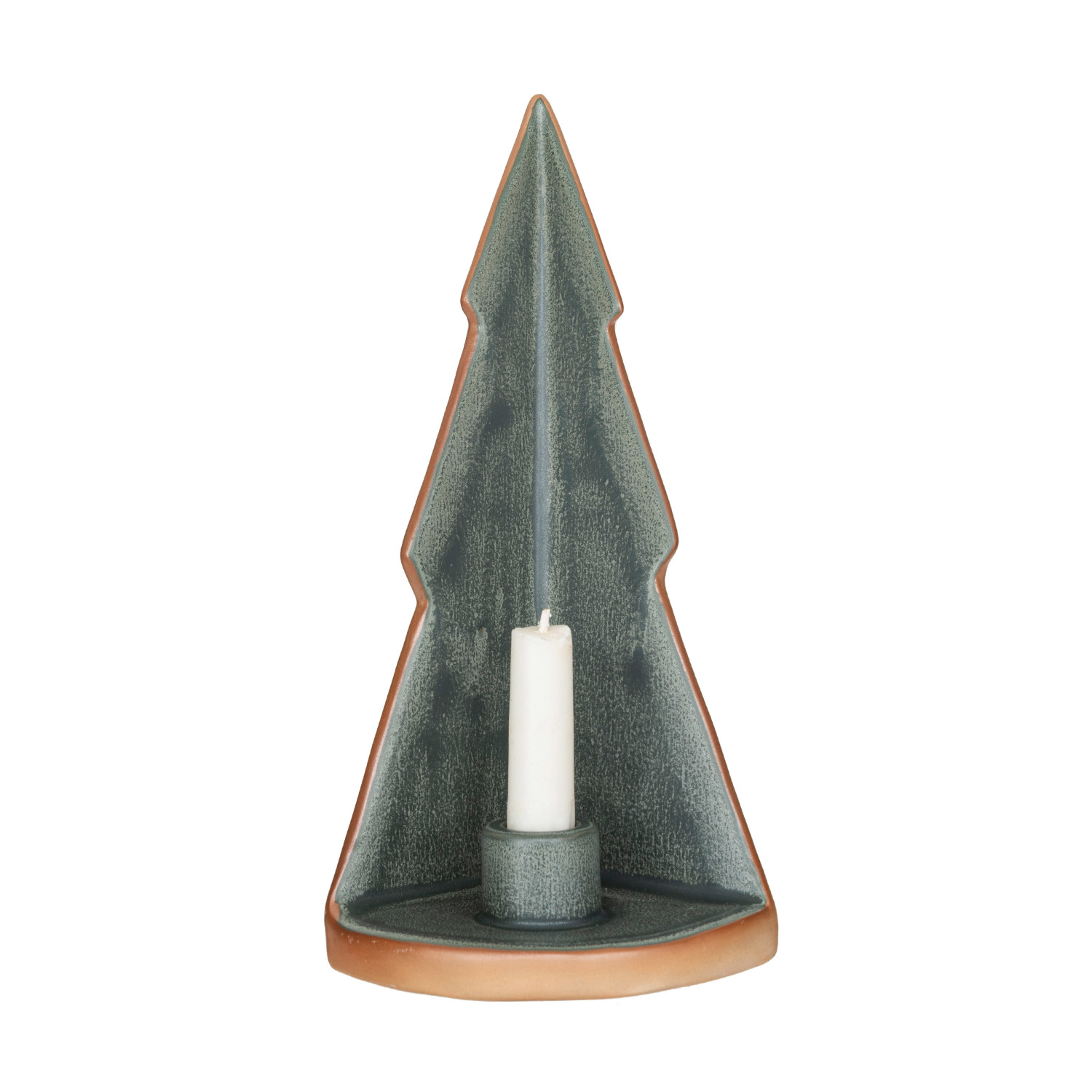 This stoneware tree taper candleholder is a fusion of natural beauty and artistic design. Standing at 11.25 inches tall, with a base 5.75 inches long and 5 inches wide, it's a significant presence in any room. The reactive glaze in shades of green, alongside the unglazed portions, gives each candleholder a one-of-a-kind look, ensuring that every piece is unique. Whether lit or unlit, it's a captivating addition to the decor. The intricate details of the tree branches and leaves add a touch of elegance to the overall design. Perfect for creating a cozy and inviting atmosphere in any home, this candleholder is sure to be a conversation starter among guests. A stately stoneware tree taper candleholder with a reactive glaze in verdant green, paired with unglazed sections for a rustic touch. An artistic addition that brings the tranquility of the forest into the home with its tree-like silhouette. Ideal for creating a peaceful ambiance, perfect for seasonal displays or as a year-round decorative element.