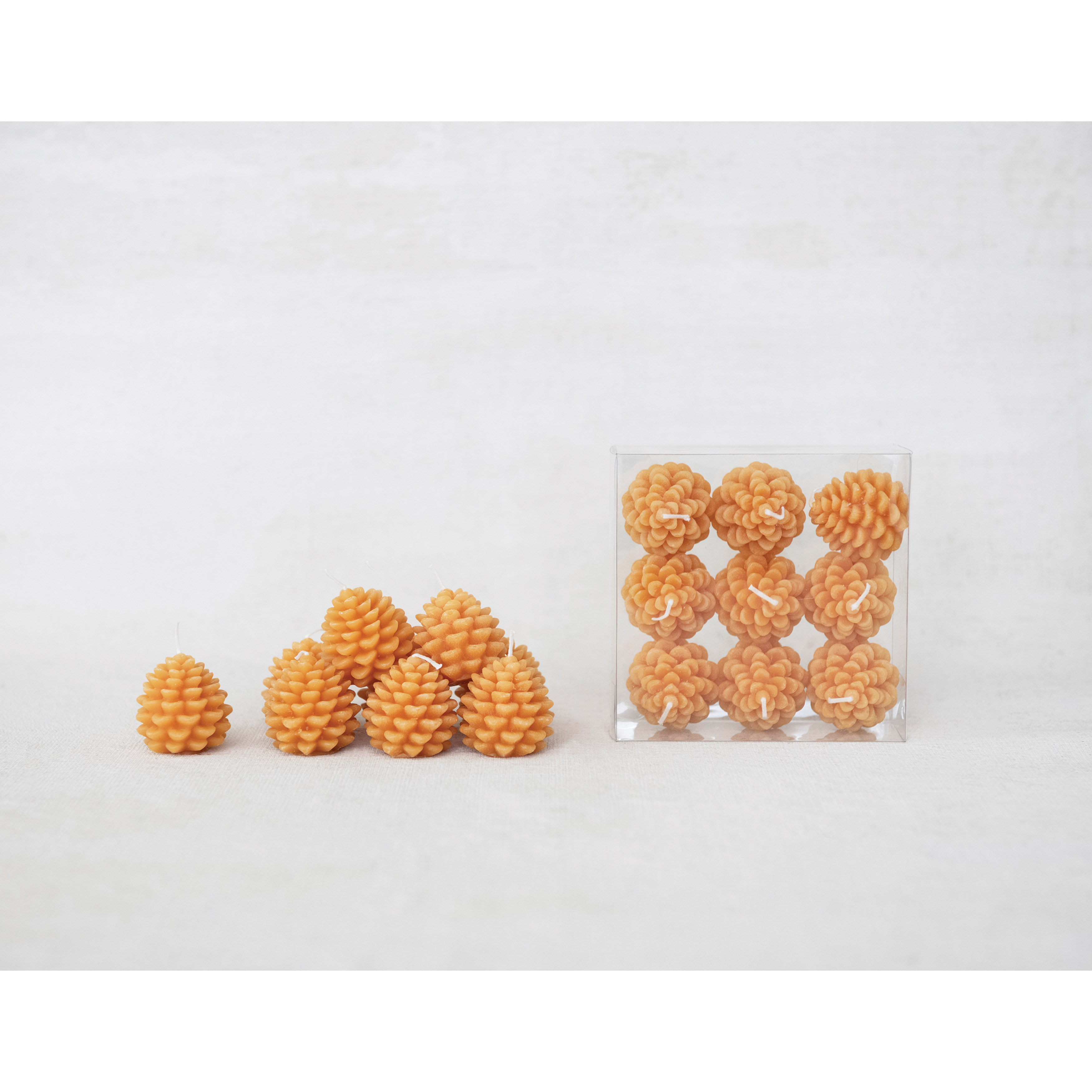 Catalog Name: 1-1/2"H - 1-3/4"H Unscented Pinecone Shaped Tealights In Box, Honey Color, Set of 9, 2 Styles (Approximate Burn Time 20 Min)