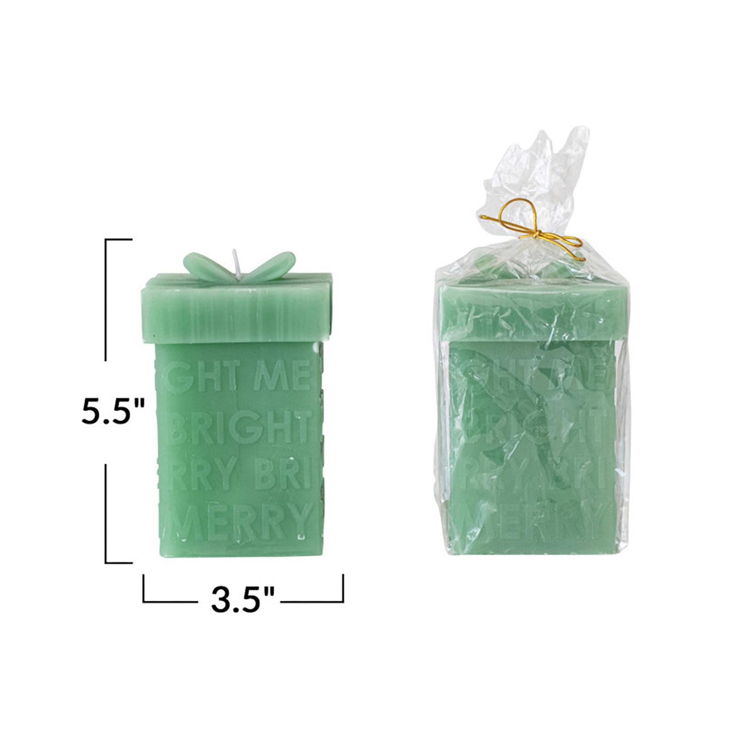 Catalog Name: 3-1/2" Square x 5-1/2"H Unscented Gift Box Shaped Candle "Merry/Bright", Green (Approximate Burn Time 75 Hours)