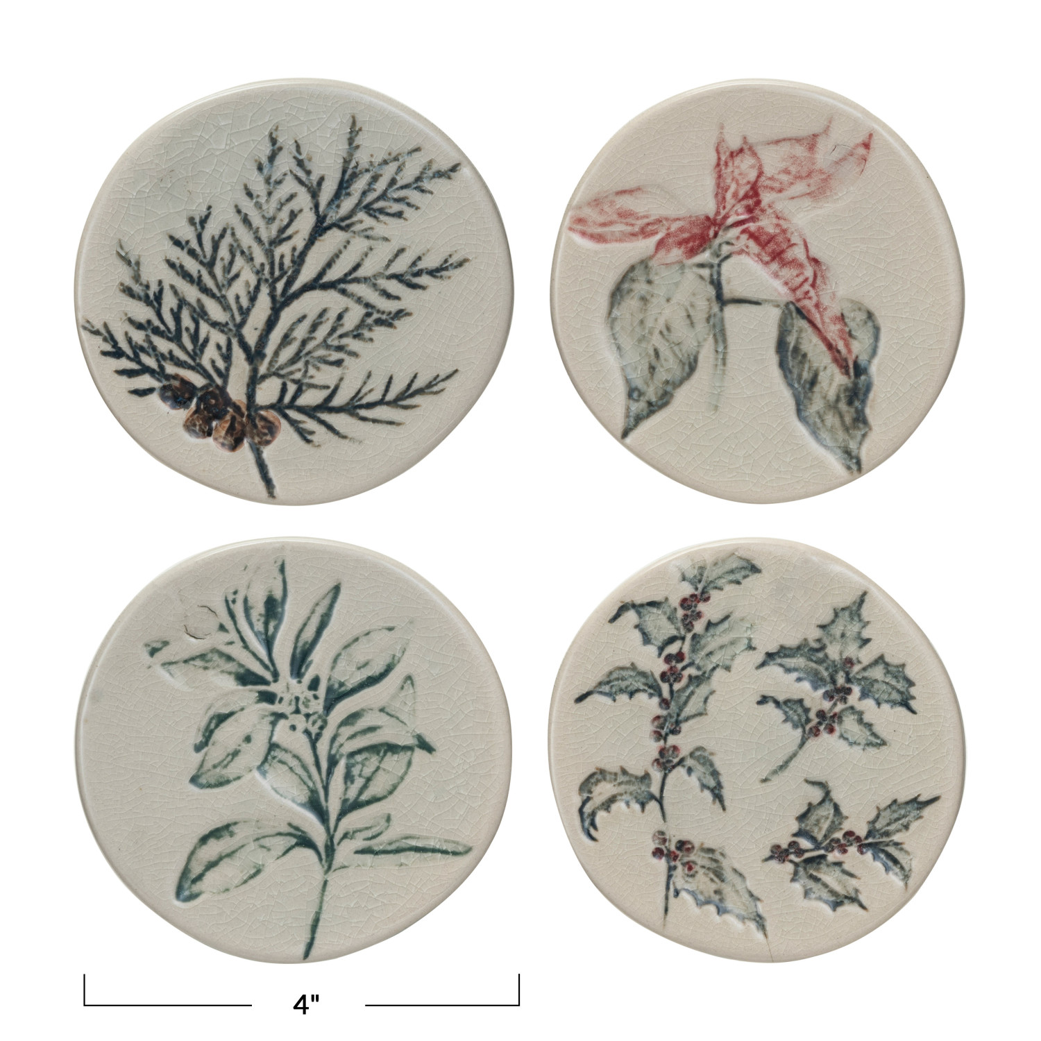 Catalog Name: 4" Round Debossed Stoneware Coasters w/ Seasonal Botanicals & Jute Tie, Crackle Glaze, Multi Color, Set of 4 (Each One Will Vary)