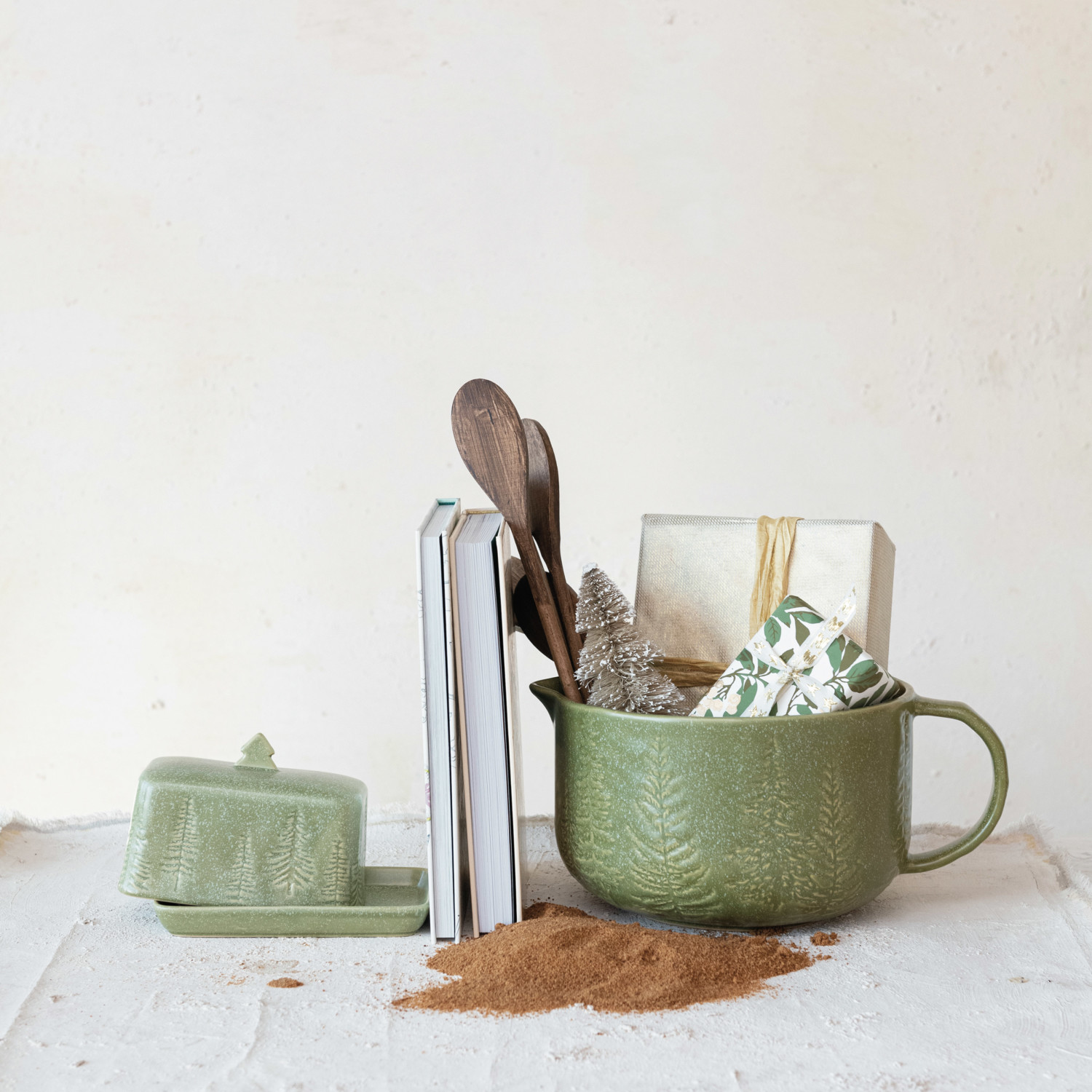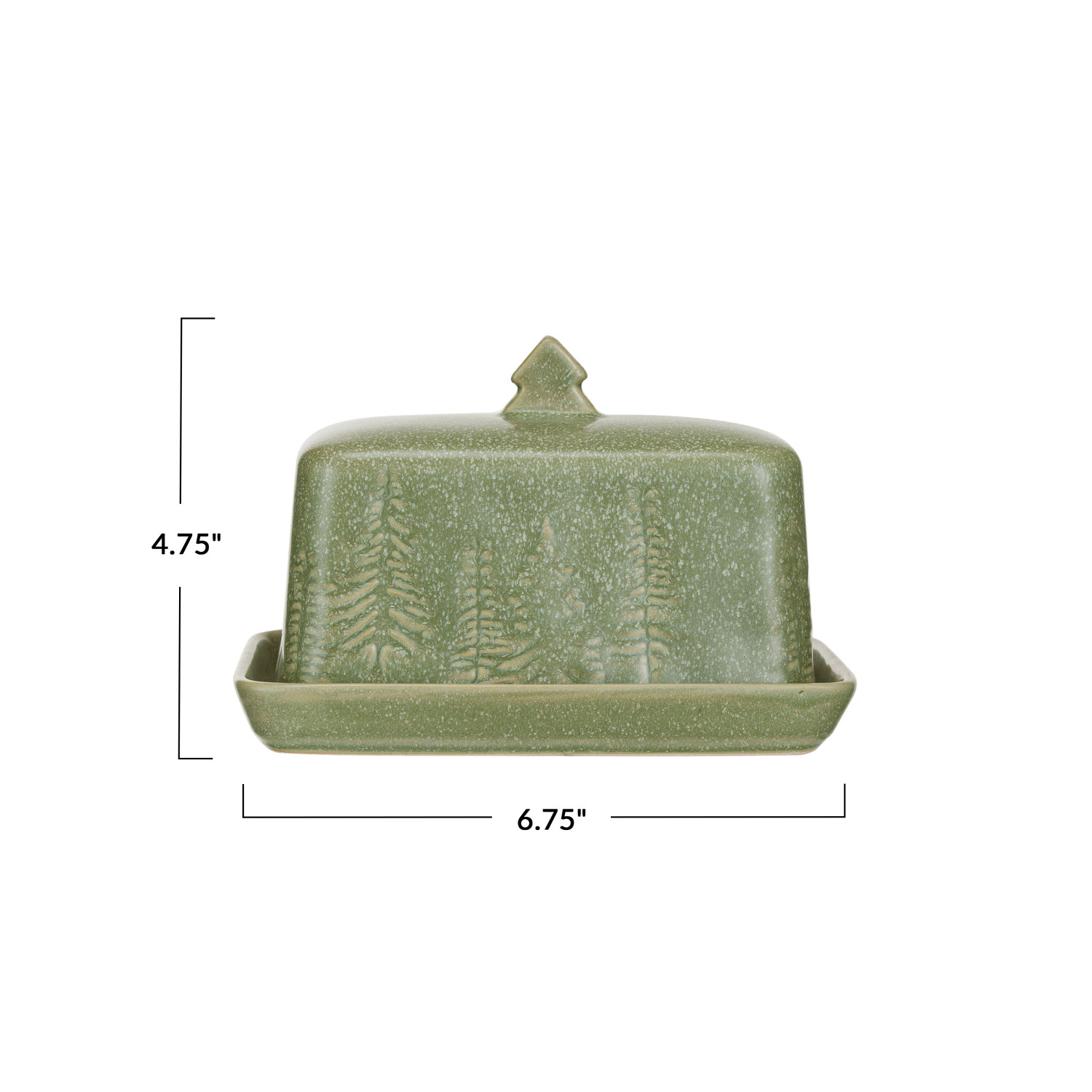 Catalog Name: 6-3/4"L x 4-1/4"W x 4-3/4"H Debossed Stoneware Butter Dish w/ Trees, Matte Reactive Glaze, Green (Each One Will Vary)