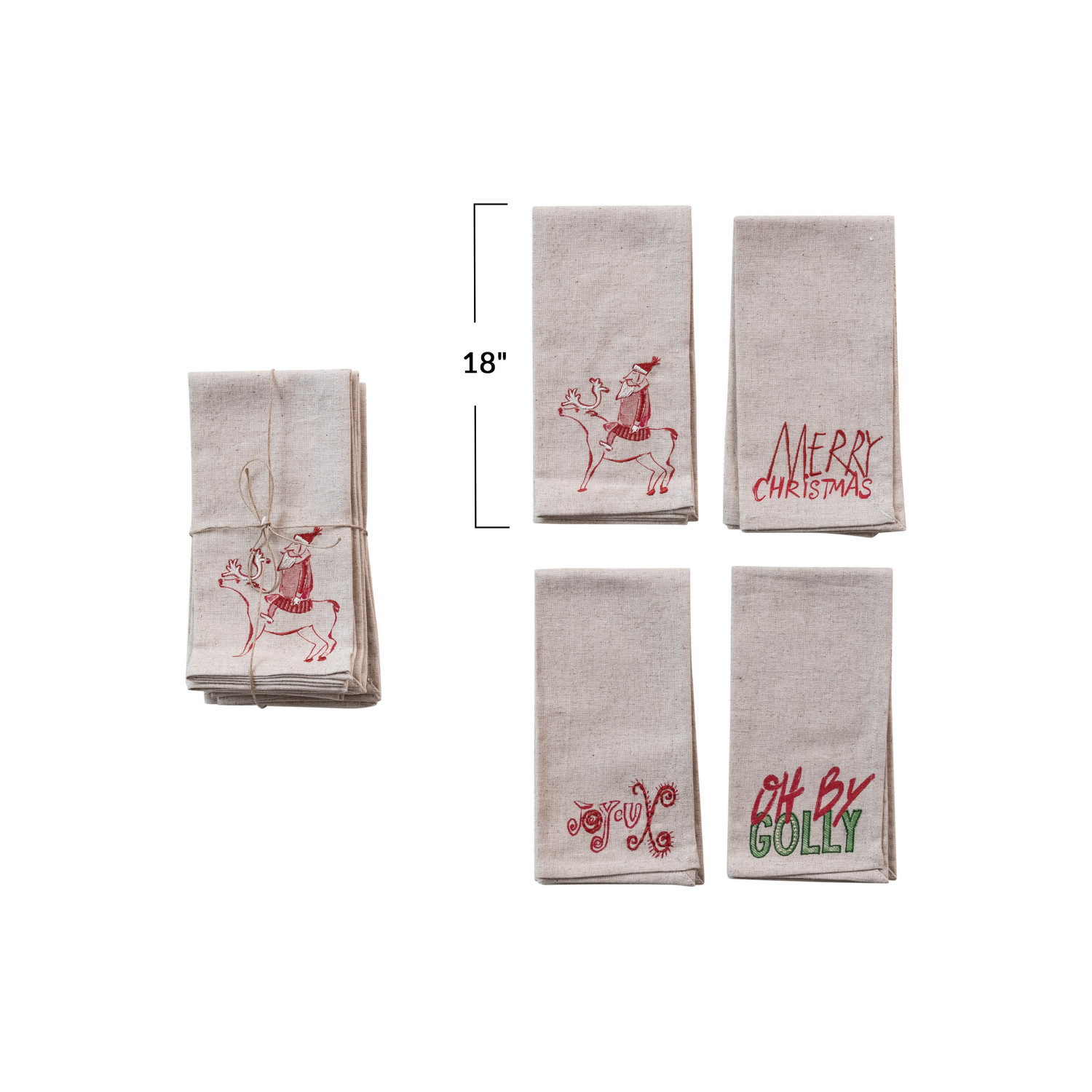 Catalog Name: 18" Square Cotton Printed Napkins w/ Embroidered Christmas Saying/Image, Natural, Red & Green, Set of 4 ©