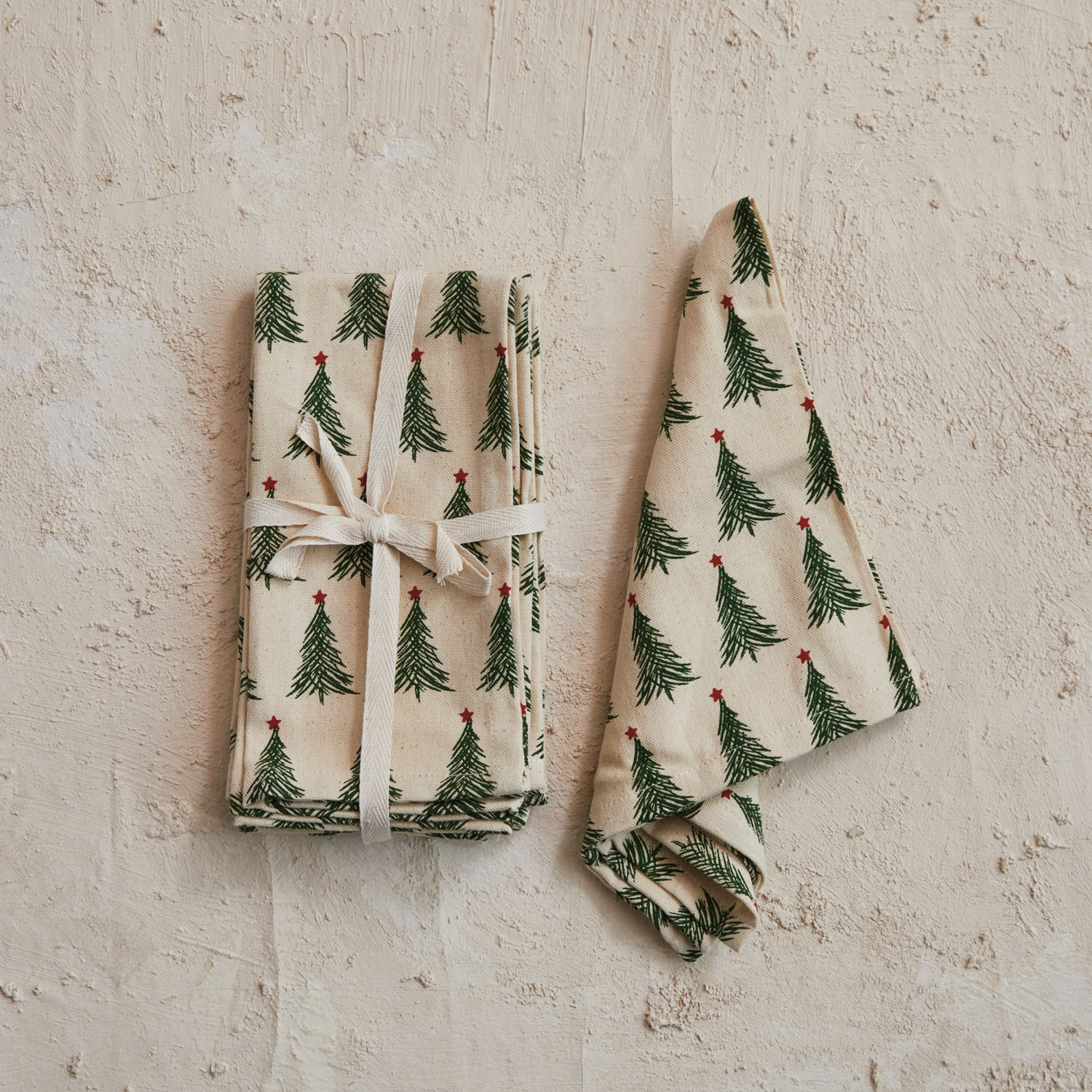 Add some warmth and cheer to the holiday table with these stonewashed cotton napkins with a Christmas tree print. This set of four napkins is made of 100% cotton that has been stonewashed for a vintage look and feel. The napkins feature a charming Christmas tree print in green and red on a natural background that will complement any festive decor. The napkins are soft, sturdy, and easy to care for. They can be machine washed and tumble dried for convenience. They measure 18 inches by 18 inches and are versatile enough to be used for any meal or snack. From casual meals to special occasions, dress any table with these versatile and stylish table napkins. A cozy and festive set of napkins that features a charming Christmas tree print in green and red on a natural background. A great addition to any holiday table, whether hosting a family dinner, a potluck, or a gift exchange. These napkins are soft, durable, and easy to wash, making them ideal for everyday use or special occasions.