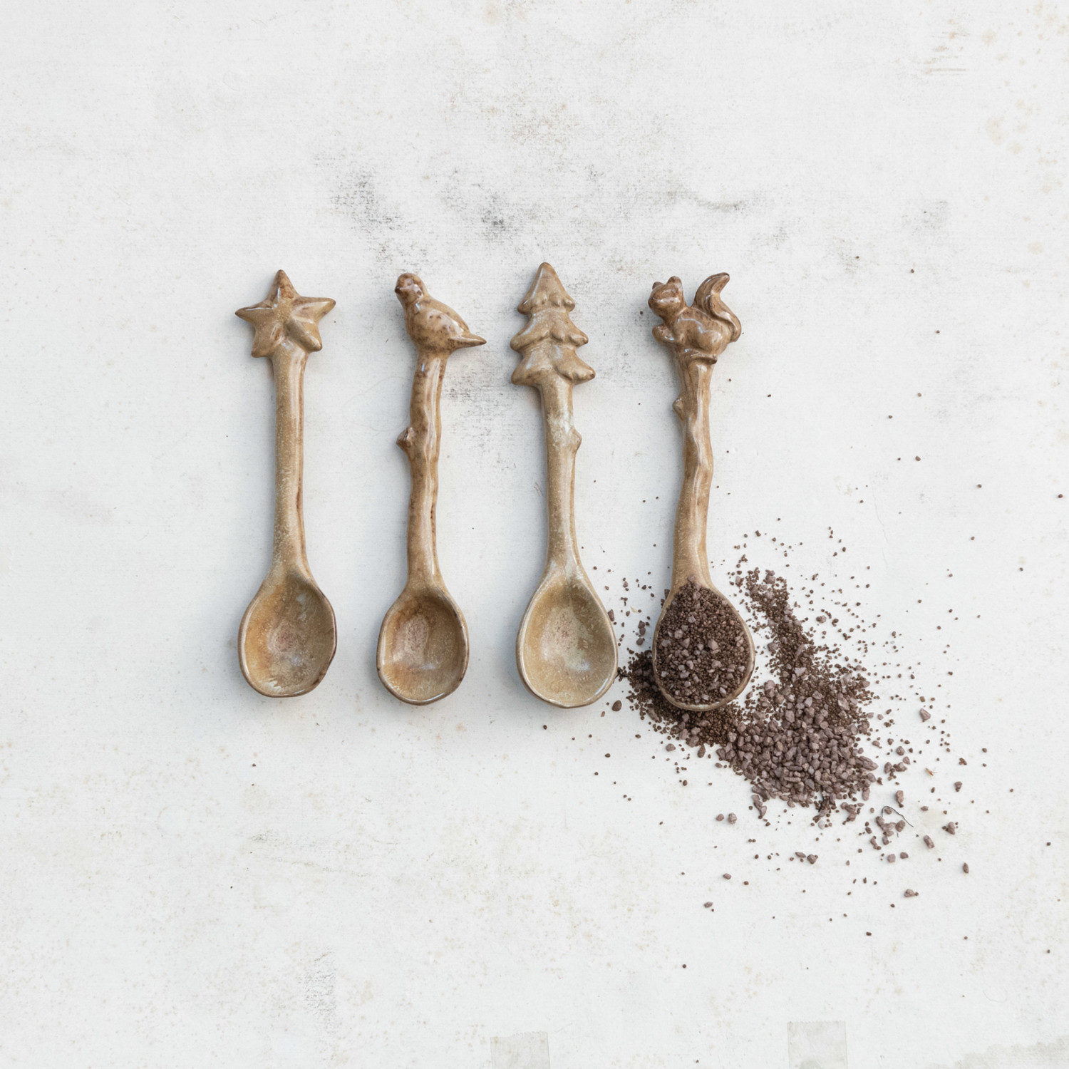 Catalog Name: 5-3/4"L - 6"L Stoneware Spoon w/ Animal/Star/Tree Shaped Handle, Reactive Glaze, Brown, 4 Styles (Each One Will Vary)