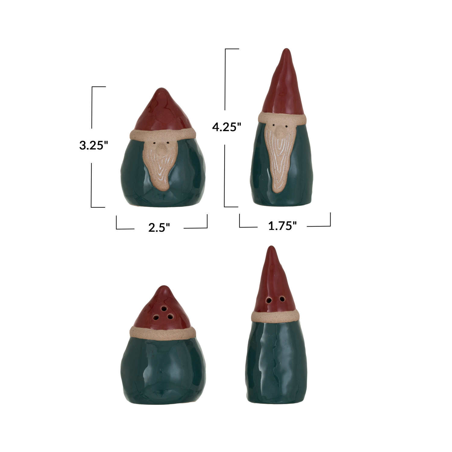 Catalog Name: 1-3/4" Round x 4-1/4"H & 2-1/2" Round x 3-1/4"H Stoneware Gnome Salt & Pepper Shakers, Multi Color, Set of 2