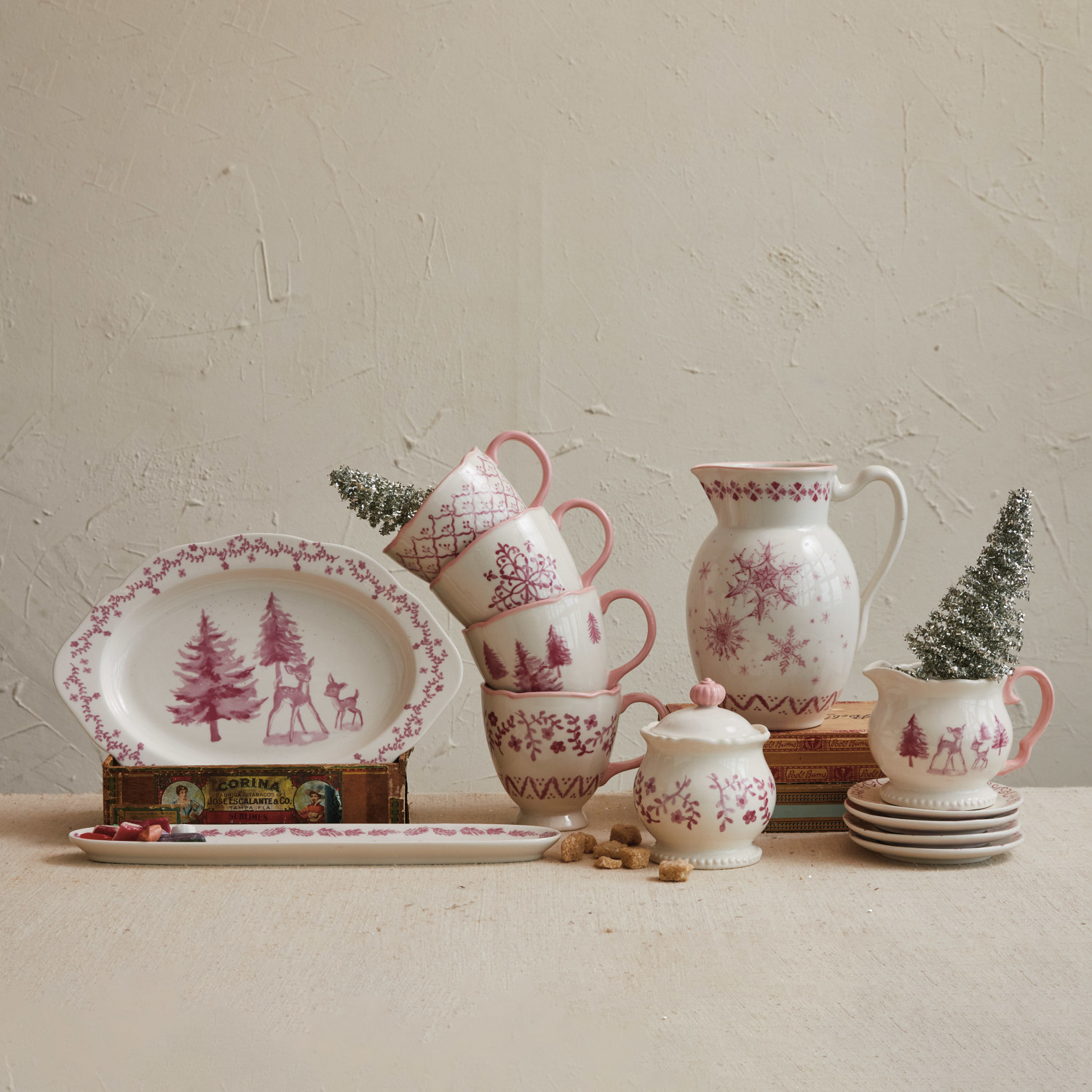 Stoneware Platter w/ Deer & Trees, Pink & Cream Color
