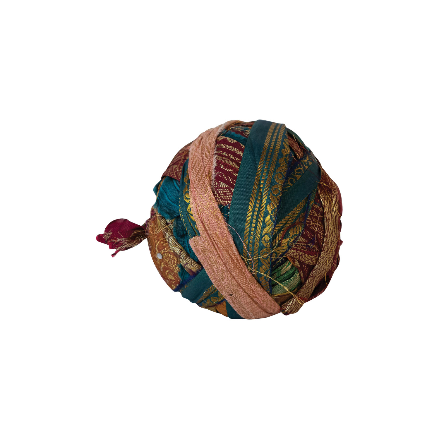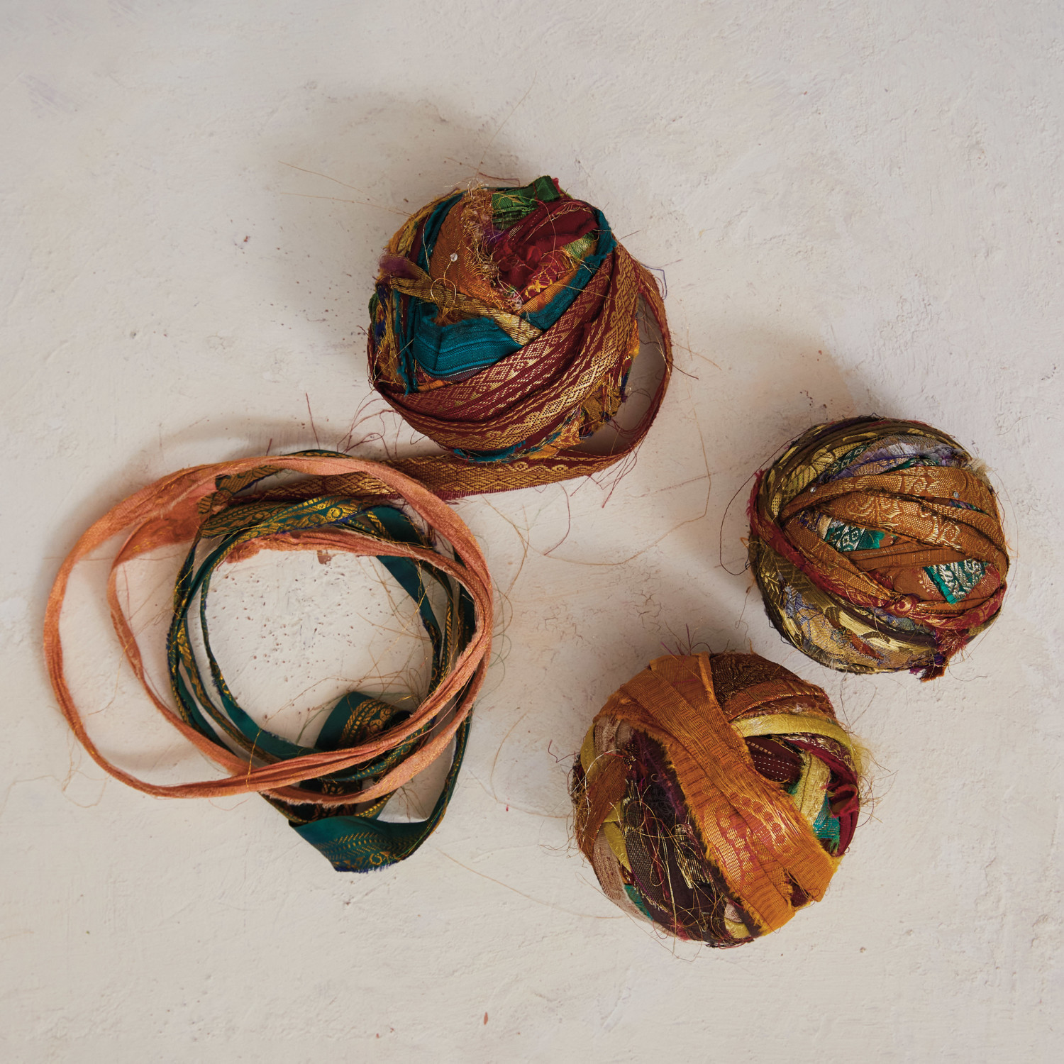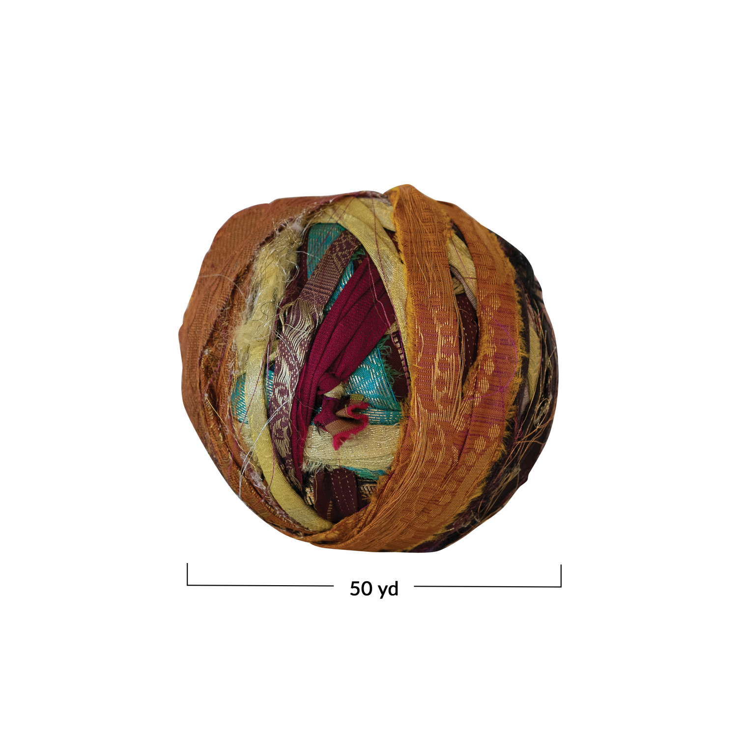 Embrace sustainable style with this unique assortment of 50 yards of torn sari ribbon. Made from sari fabric, this ribbon boasts a vibrant mix of colors and shimmering metallic threads. Due to the nature of the product, each assortment is one-of-a-kind, offering a surprise of beautiful patterns and colors every time. This variety of textures and hues is perfect for unleashing creativity in gift wrapping, crafting projects, or adding a touch of unique style to home decor. The hand-torn nature of the ribbon adds a touch of rustic charm, while the varying widths ensure the perfect size for any project.