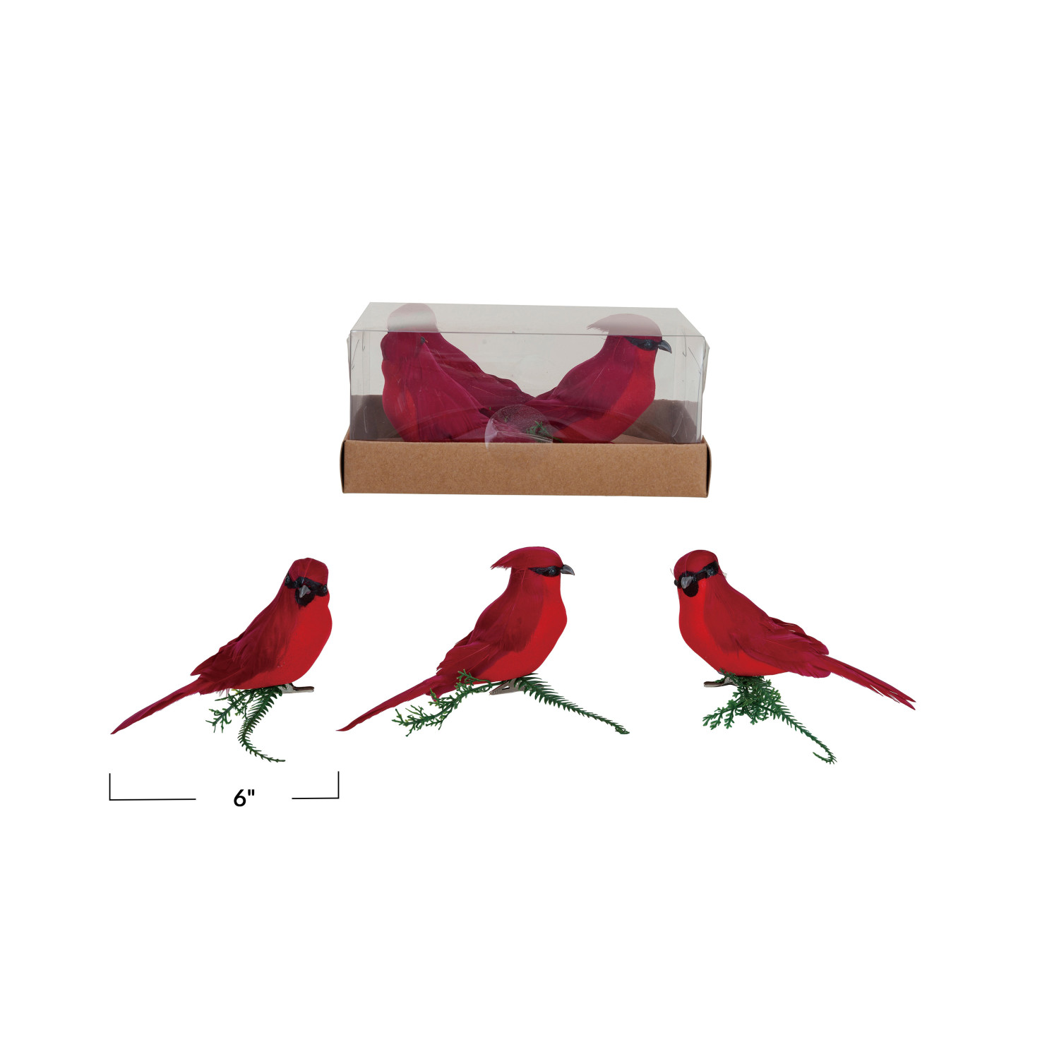 Catalog Name: 6"L x 5-1/2"W Foam & Feather Cardinal Clip-on Ornaments, Red, Boxed Set of 3