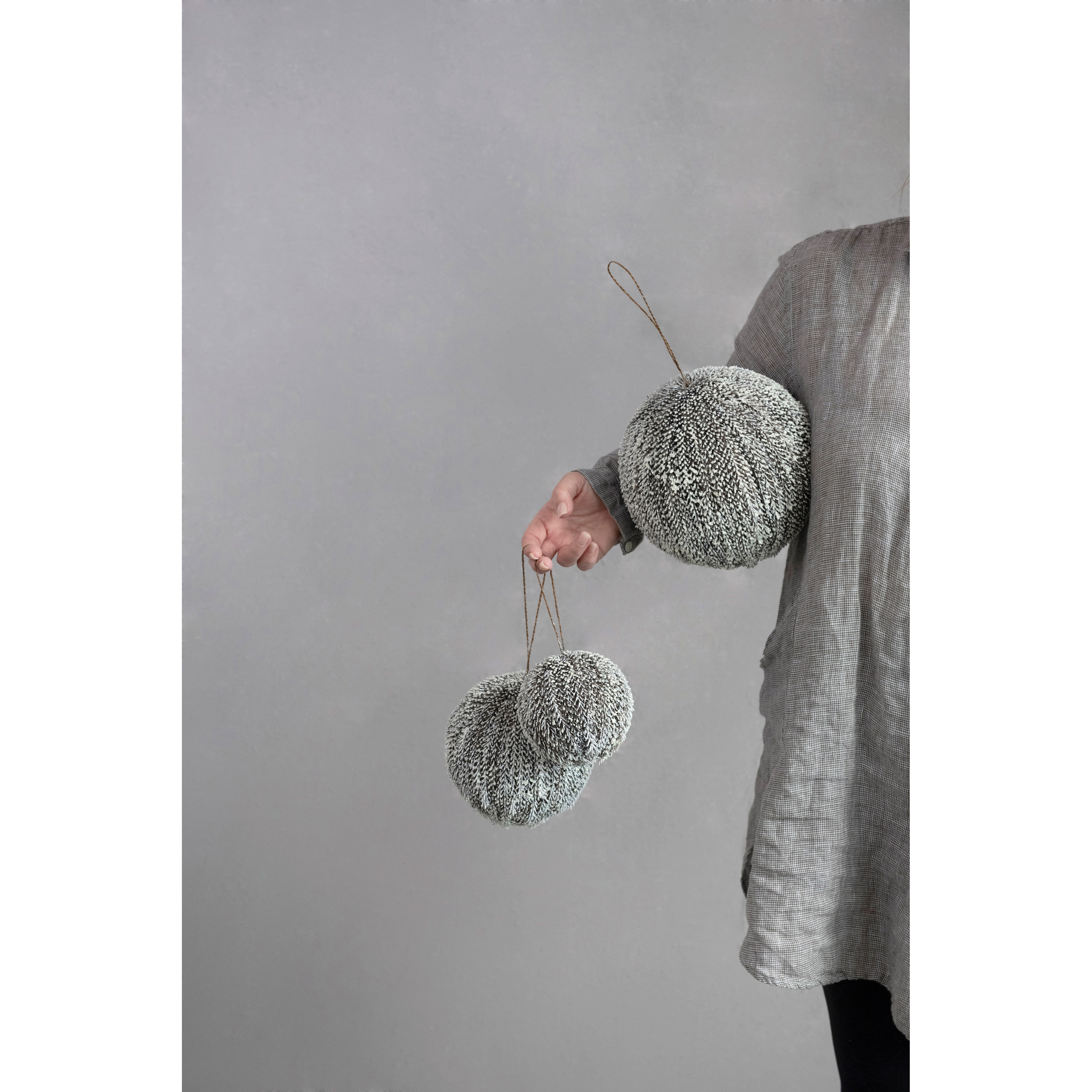 Brown textured plastic ball ornament with a snow finish; Add to a seasonal display for a dash of whimsical holiday charm; Made from 75% Plastic, 25% Polyfoam. Add to a seasonal display for a dash of whimsical holiday charm.