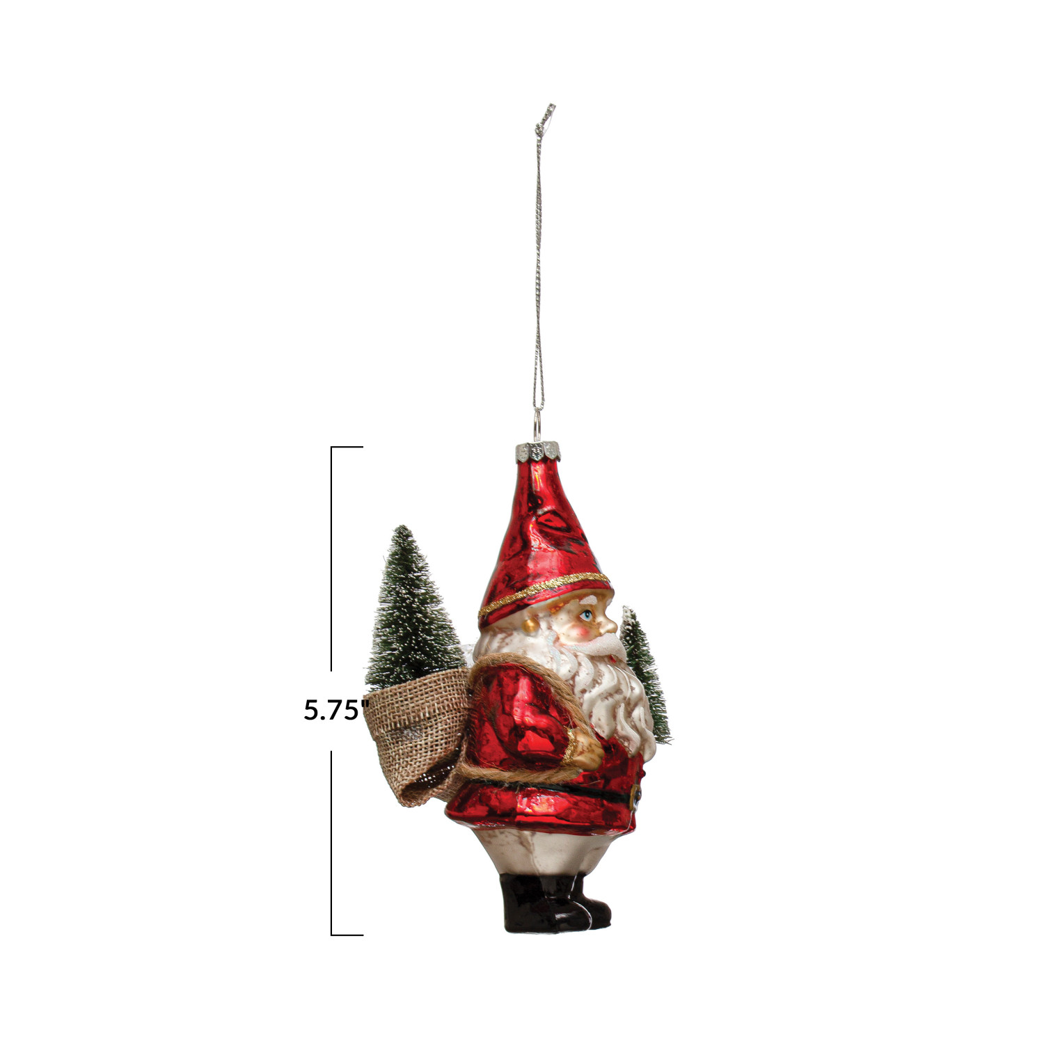 This vintage-inspired glass garden Santa ornament features hand-painted details, glitter, and a tiny sack of bottle brush trees on his back. Ornaments can be showcased as decorations on a Christmas tree, wreath, or atop a festive centerpiece, hung from doorways, displayed on mantels, used to embellish cards and presents, or given as gifts.