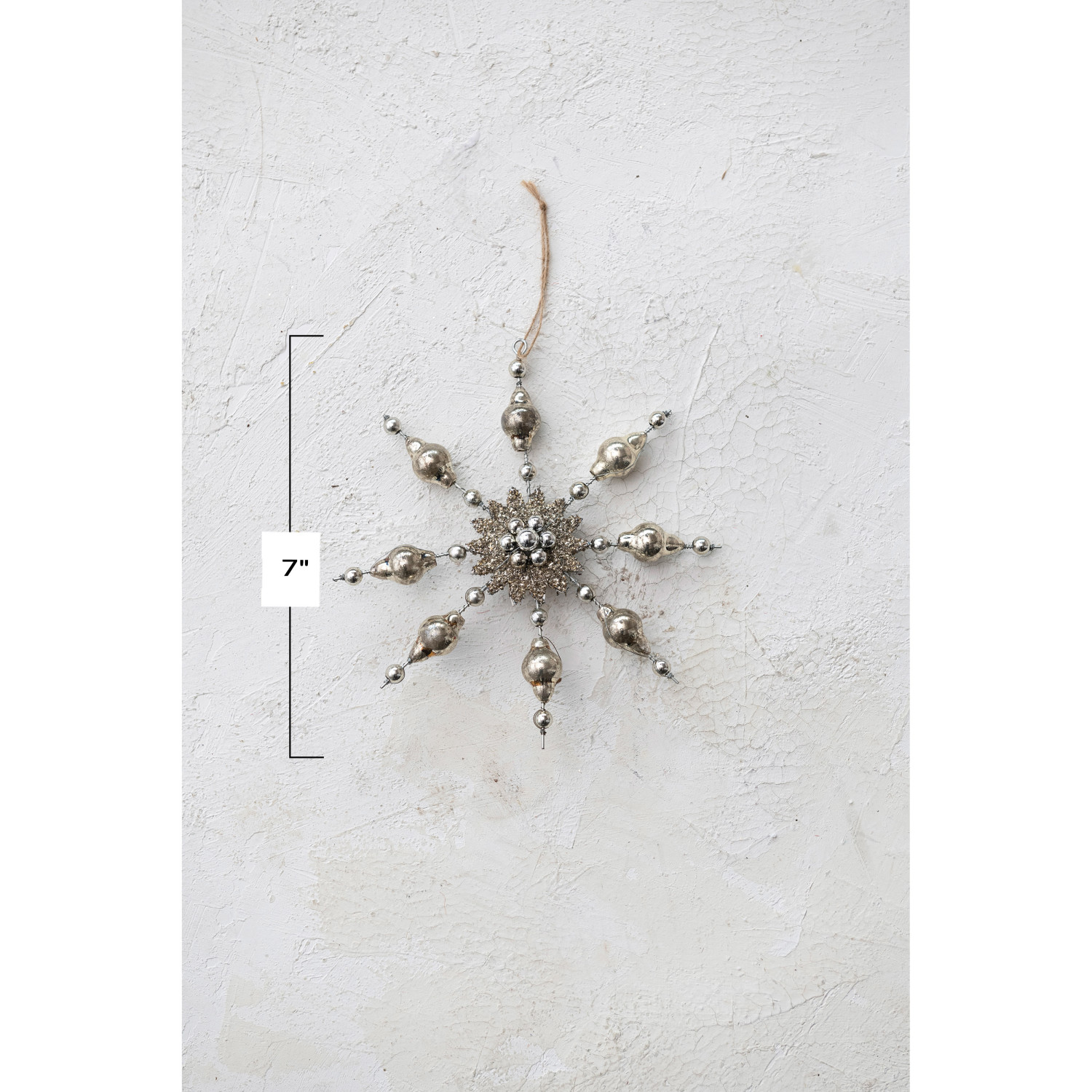 Catalog Name: 7"H Mercury Glass Snowflake Ornament w/ Tinsel, Silver Finish