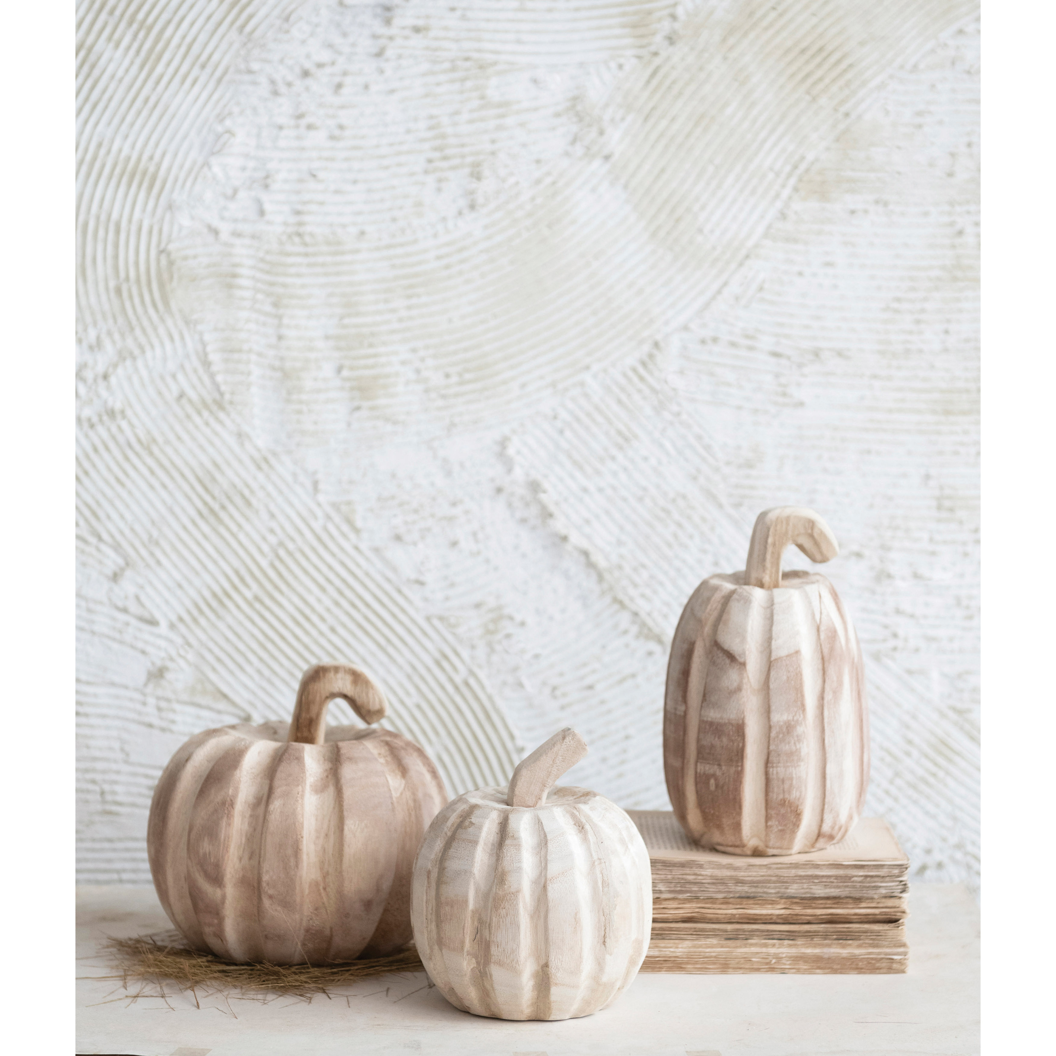 Hand-carved from 100% paulownia wood pumpkin with a natural finish. Add to a seasonal display for a dash of whimsical autumn charm.