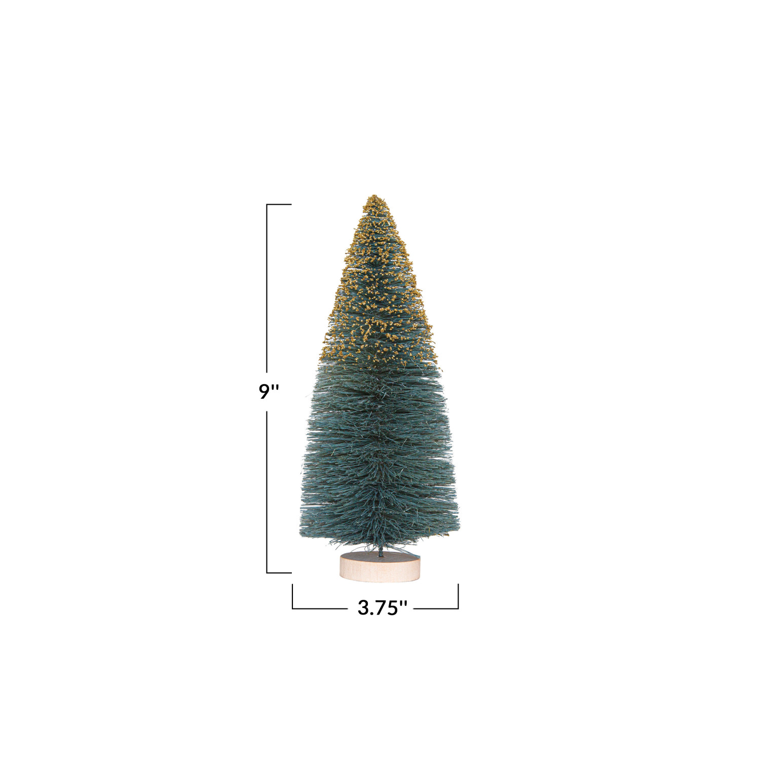 3-3/4" Round x 9"H Sisal Bottle Brush Tree w/ Gold Glitter & Wood Base, Green