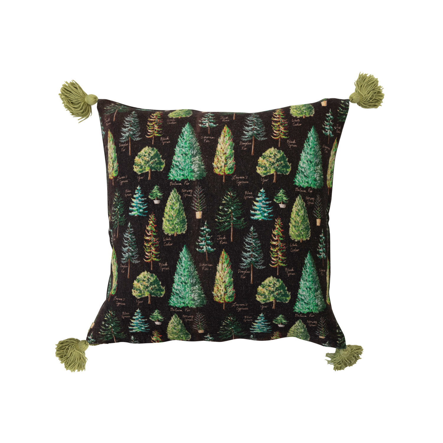 This contemporary 2-sided linen blend throw pillow features 3 styles of labeled evergreens on one side, small printed evergreens on the other, and decorative tassels. Celebrate the holidays in style with our charming collection of holiday throw pillows, featuring cozy designs from classic motifs to modern patterns, and luxurious materials to create a warm and inviting atmosphere.
