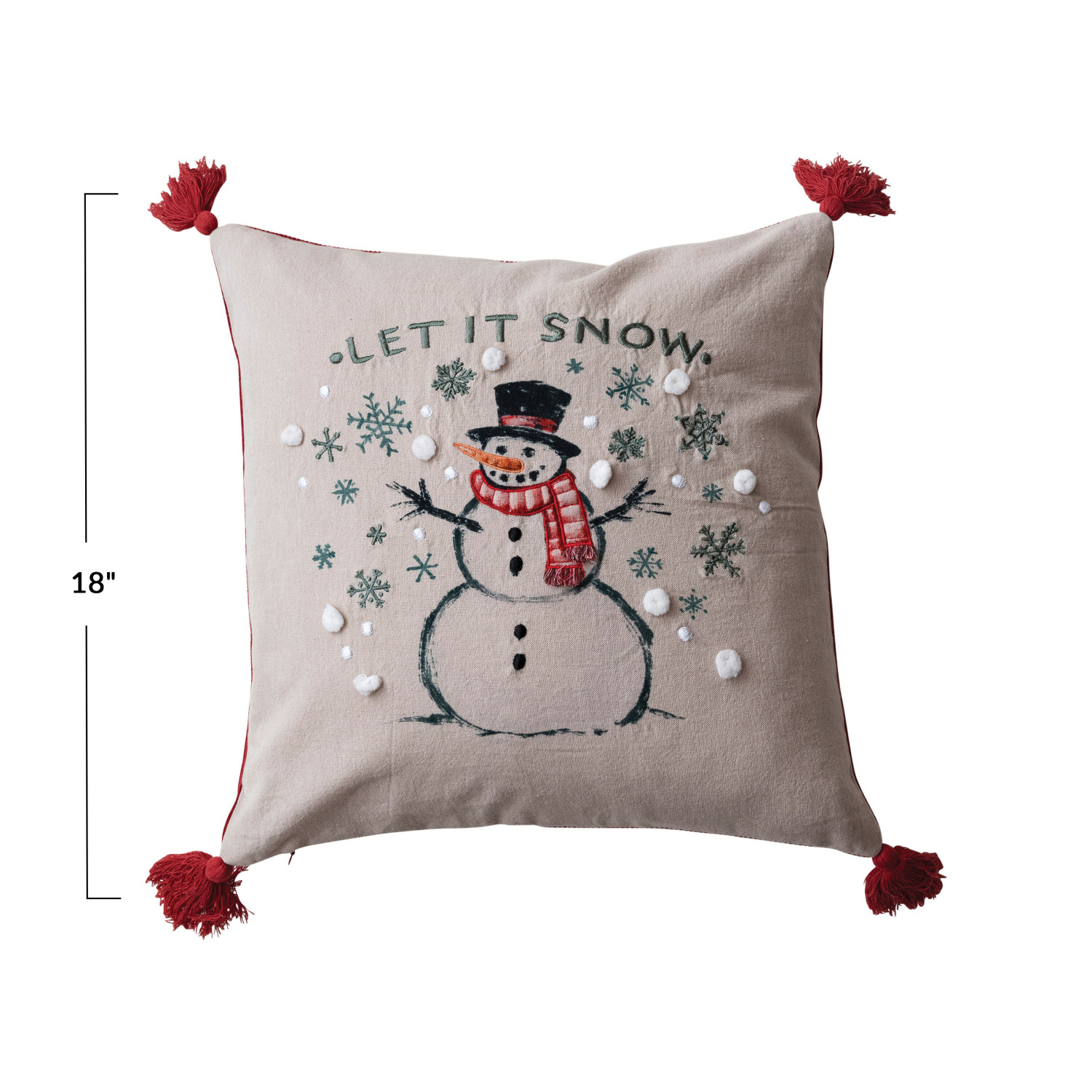 Catalog Name: 18" Square Cotton Printed Pillow w/ Snowman, Embroidery, Pom Poms, Tassels & Corduroy Back "Let It Snow", Multi Color ©