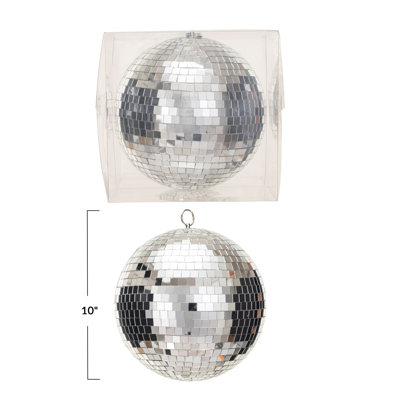 Catalog Name: 10" Round Hanging Glass & Foam Disco Ball w/ Acetate Box, Silver Finish