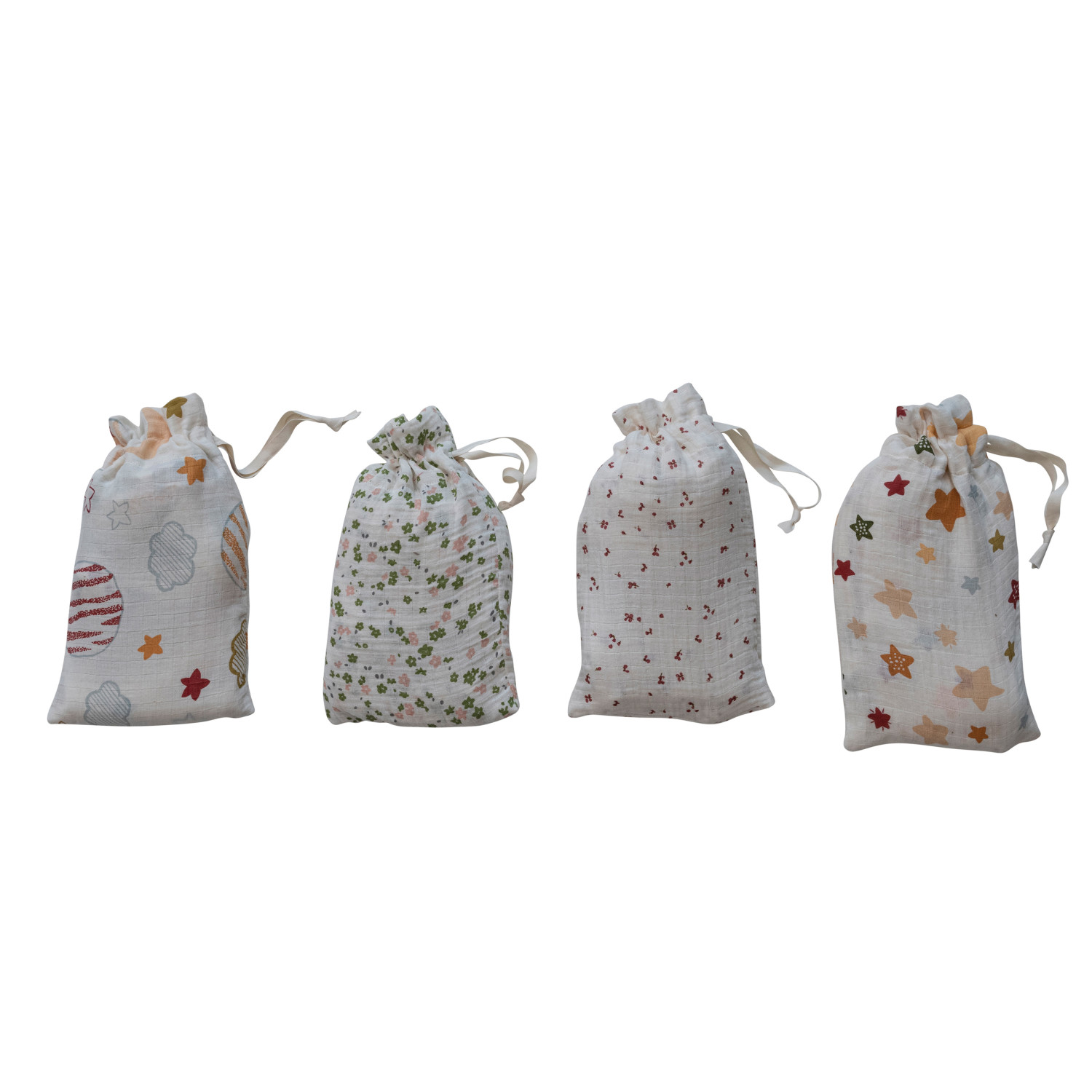 Catalog Name: 41" Square Cotton Muslin Double Cloth Printed Swaddle w/ Pattern & Matching Printed Drawstring Bag, Multi Color, 4 Styles