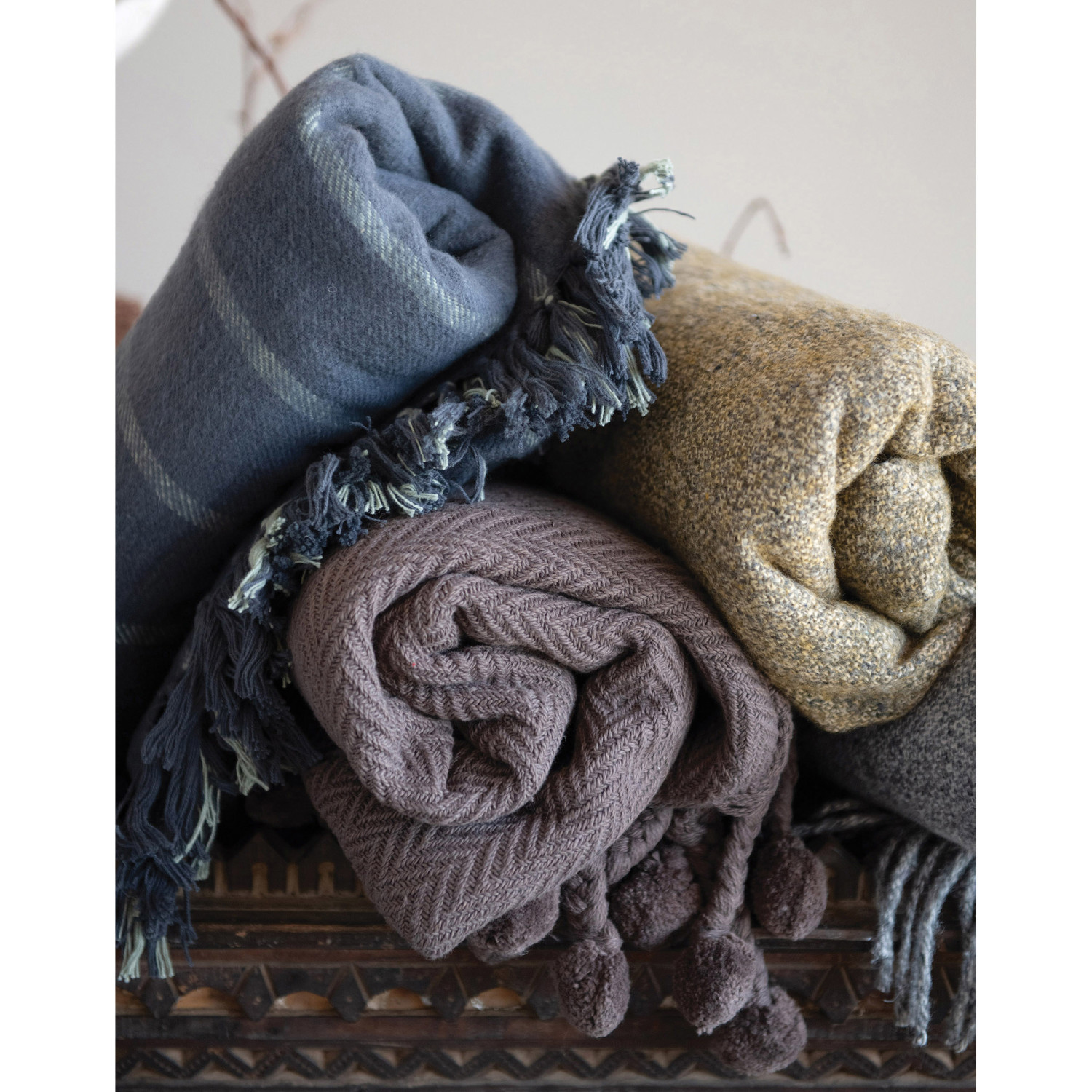 Catalog Name: 60"L x 50"W Woven Cotton Throw w/ Braided Pom Pom Tassels, Iron Color