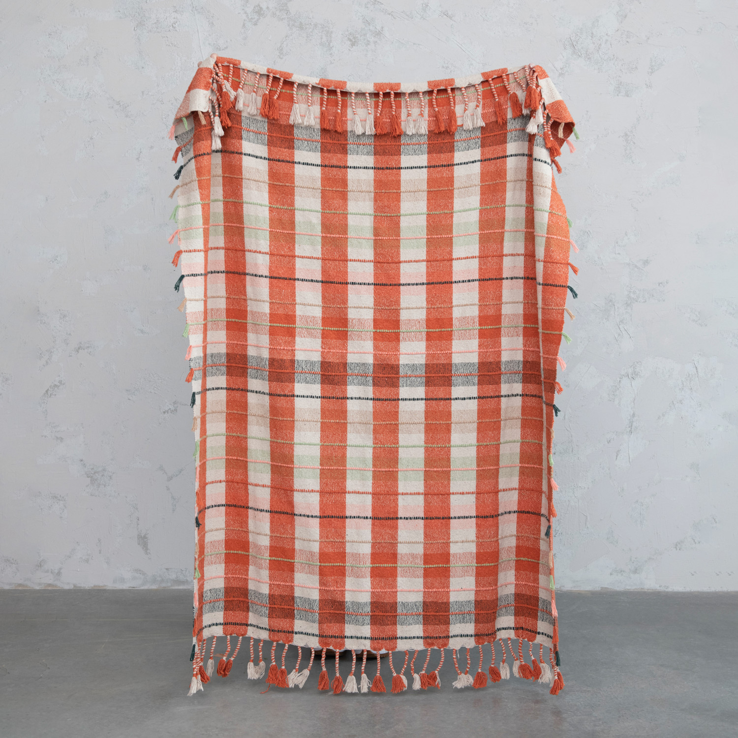 Catalog Name: 60"L x 50"W Woven Recycled Cotton Blend Throw w/ Plaid Pattern & Braided Fringe, Multi Color