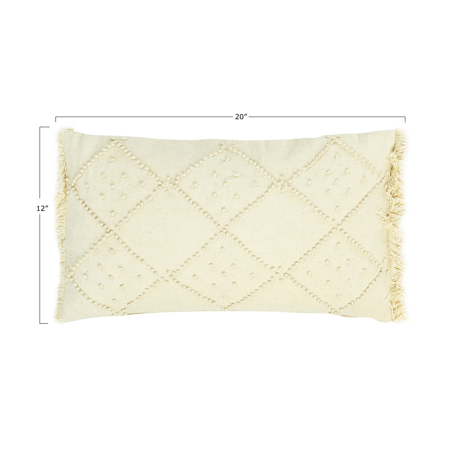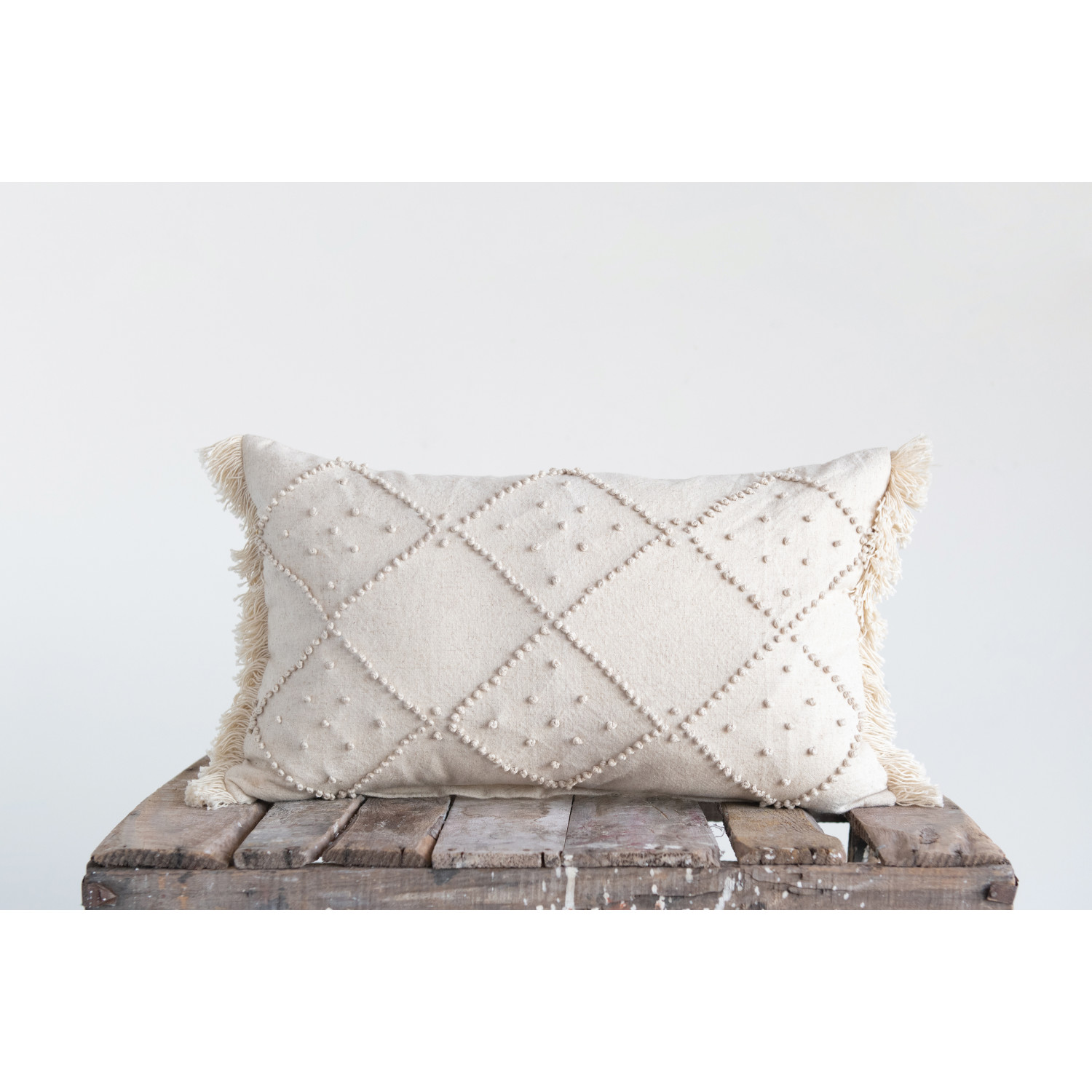 Catalog Name: 20"L x 12"H Woven Cotton & Linen Blend Lumbar Pillow w/ French Knots & Fringe, Cream Color