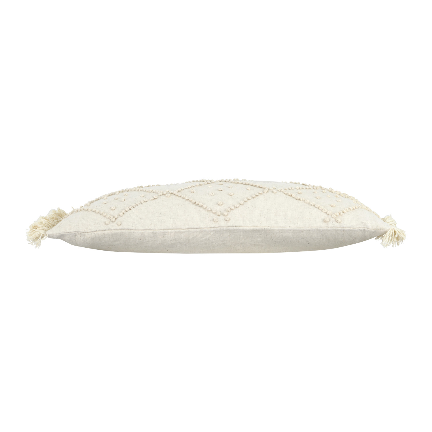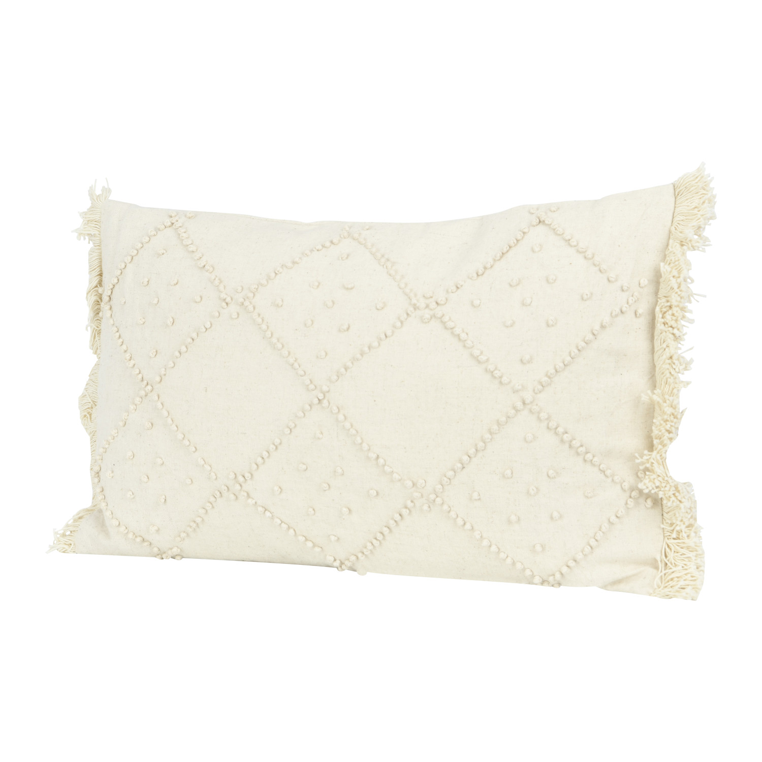 Diamond patterns, polka dots and decorative fringe are features of this elegant off-white rectangle pillow. Right at home in the luxurious home, it can be the perfect accent to the living room or bedroom decor. Off-white will add a bright and open touch to any color scheme.