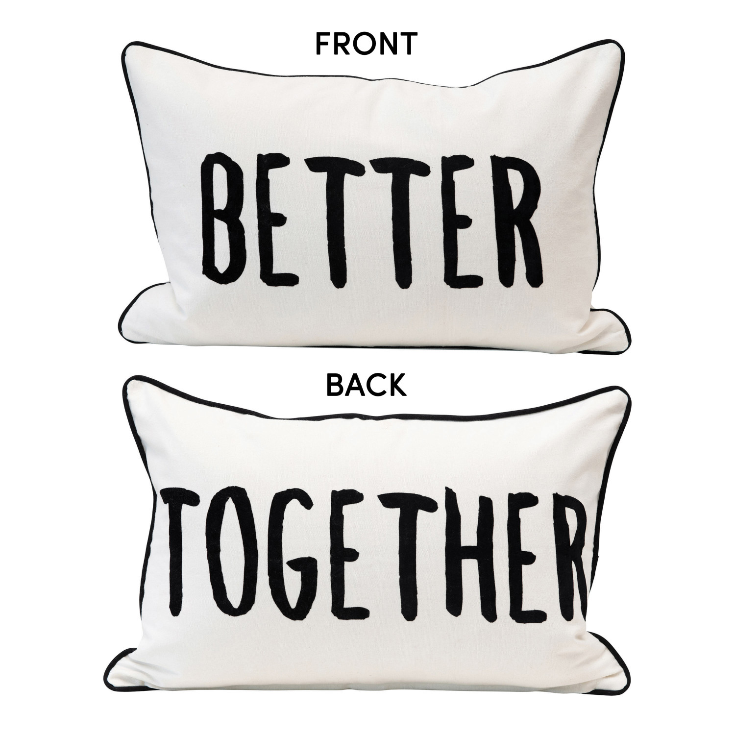 This 2 sided cotton pillow instantly upgrades any couch or chair, and catches the eye effortlessly with its "Better" and "Together" words on each side. Made out of cotton lumbar, this pillow brings both comfort and unique style to any seating and is perfect for newlyweds. Prop 65 compliant. Spot clean only.