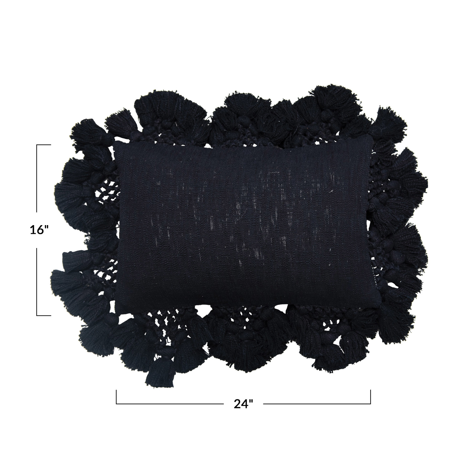 Black cotton slub lumbar pillow with crochet and tassels; Cover: 100% Cotton, Filling: 100% Polyester; 24"L x 16"W x 2"H. Prop 65 Compliant. Machine Wash Cold With Mesh Bag.