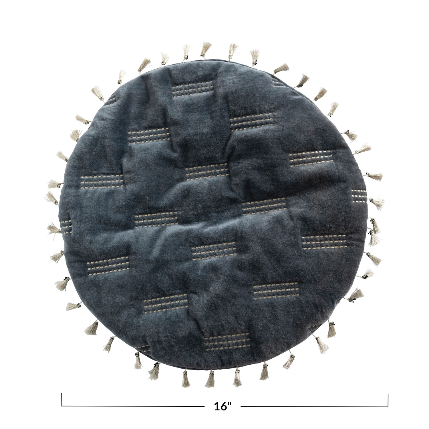 Catalog Name: 16" Round Cotton Velvet Pillow w/ Gold Metallic Thread Embroidery & Tassels, Blue