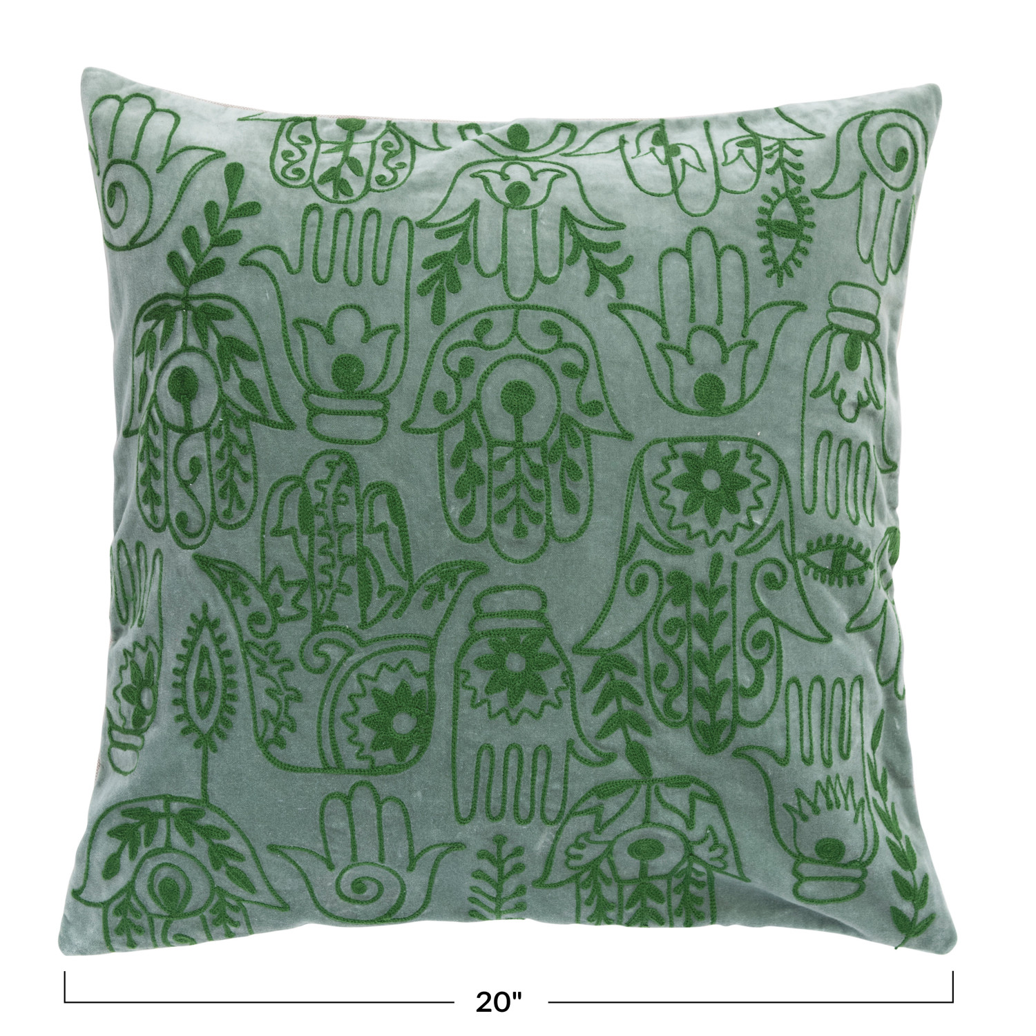 Catalog Name: 20" Square Cotton Velvet Embroidered Pillow w/ Hamsa Hand Pattern & Chambray Back, Polyester Fill, Green