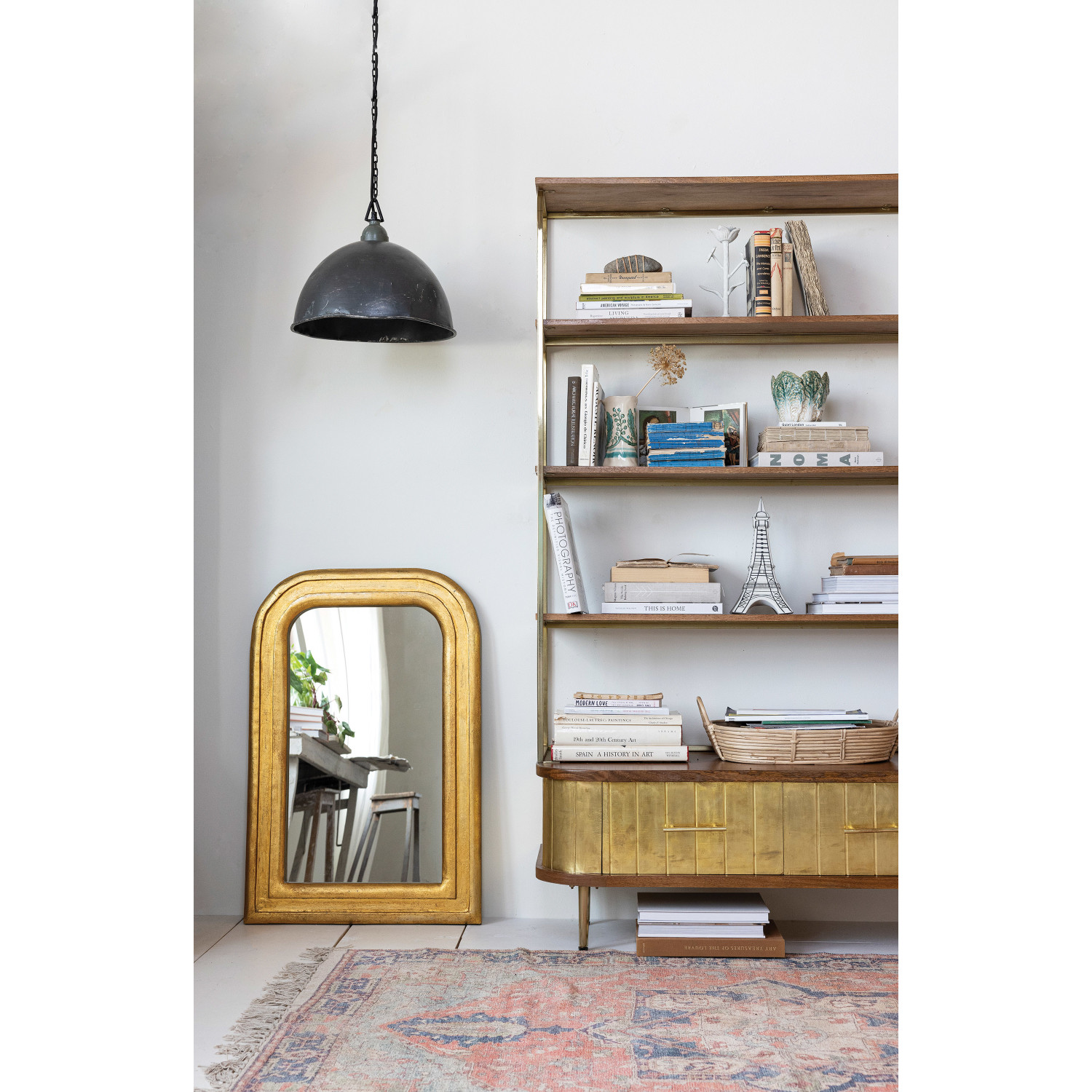Catalog Name: 23-3/4"W x 35-1/2"H Arched Mango Wood Framed Wall Mirror, Antique Gold Finish, Truck Ship