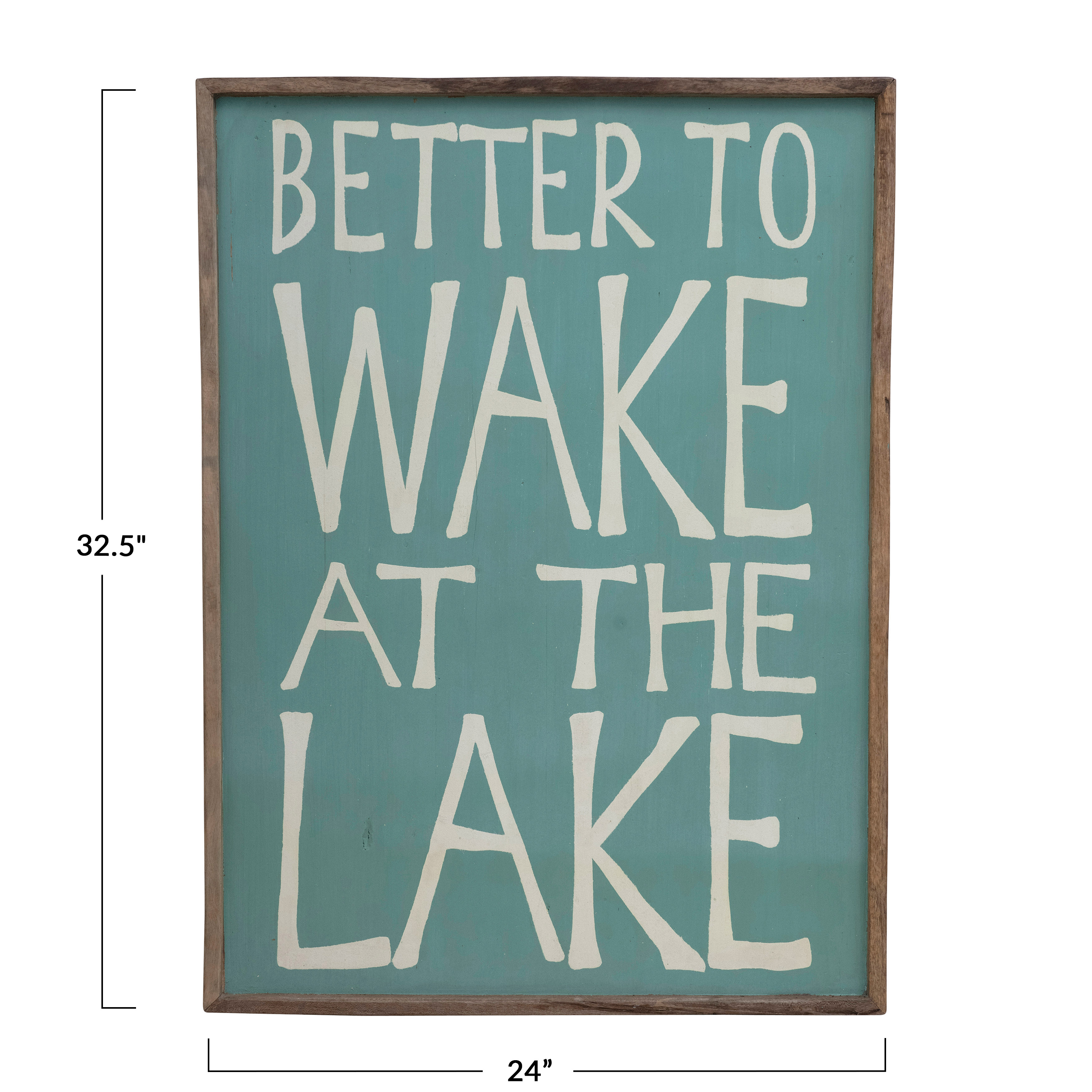 This rustic, recycled wood wall art features a playful message. Aqua and white recycled wood wall art with "better to wake at the lake" quote. Display this stunning wall decor to effortlessly enhance the design of any living space. Made from 100% recycled wood.
