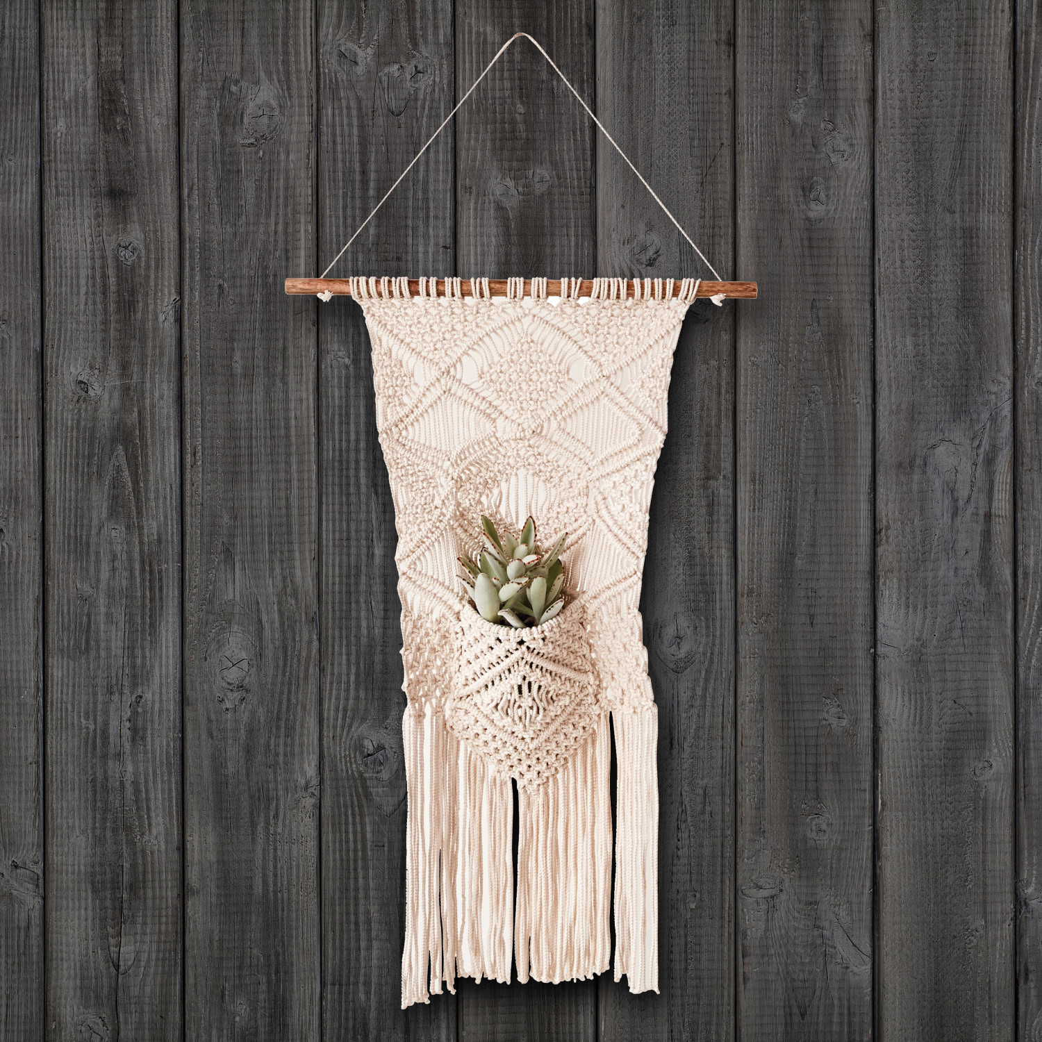 Perfect for any room in your home, this wall hanging includes a pocket. Use the pocket for a mini potted plant or flower. It can also be used for notes or other decorative items.